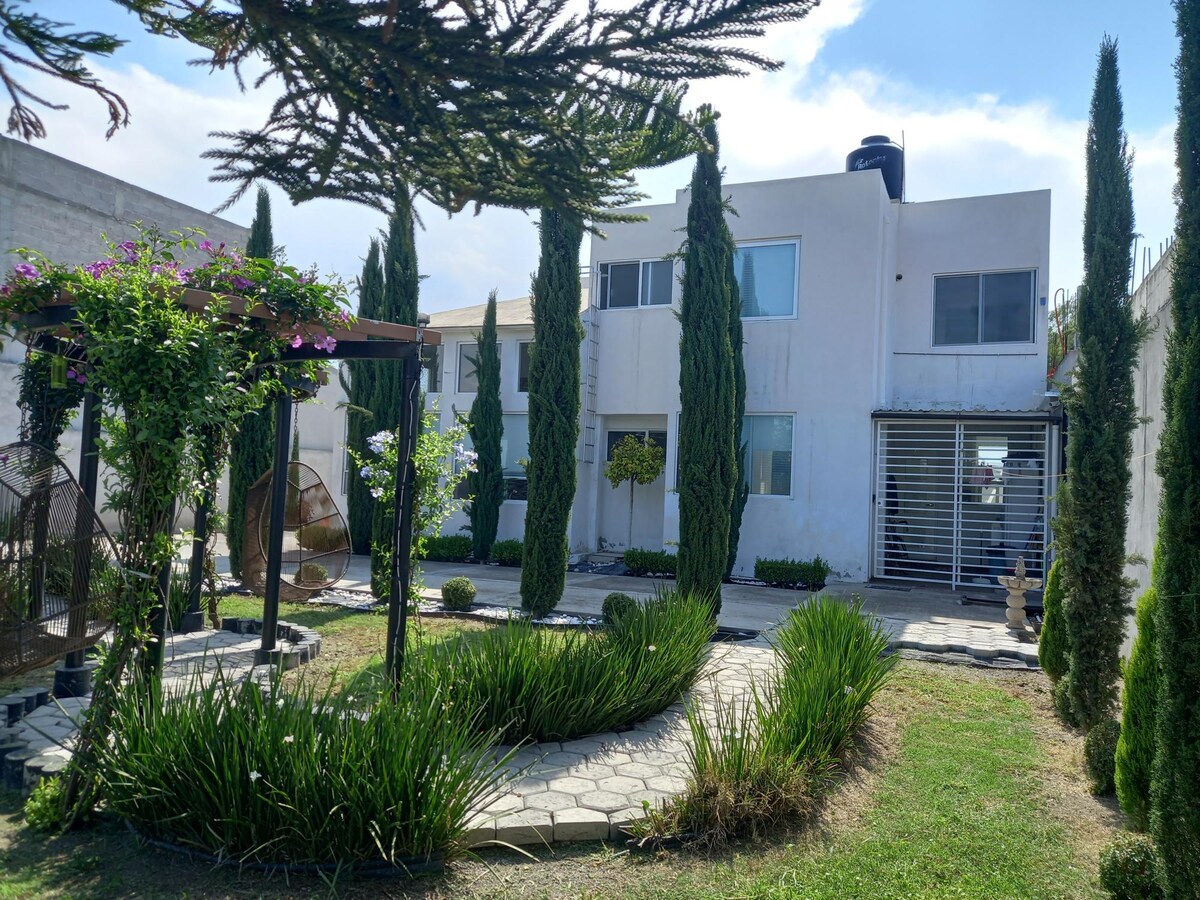 Magandang country house na may malaking pribadong hardin, mainam na lugar para sa libangan at pagpapahinga na maglaan ng ilang araw sa kompanya ng iyong mga mahal sa buhay. Halika at tamasahin ang wellness at katahimikan na inaalok ng kalikasan. Tamang - tama para sa mga executive, nakatira kasama ang pamilya, mag - asawa, maghapunan, o mag - ayos ng quinceañera o kasintahan, pagkatapos ng mapayapang pahinga. Hardin na may magandang ilaw. Fiber optic internet, net flix, max, you tube premium sa isang TV Puwede akong mag - invoice para sa iyong pamamalagi.