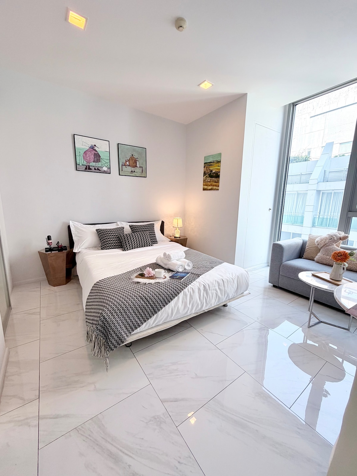 A spacious entire apartment with private bath, kitchenette, living/dining, 1 bedroom with designated working area, balcony and daybed. Enjoy the wide windows for uninterrupted views and plenty of sunlight, increasing airiness for a more relaxing stay. Enjoy all the conveniences of city-life, including: - 5 min to BTS Asok, MRT Sukhumvit - 5 min to Terminal 21, Emporium/Emquartier and Benjasiri Park - 1 min to 7-11 convenient store - Lots of street food, cafe and taxi/bikes