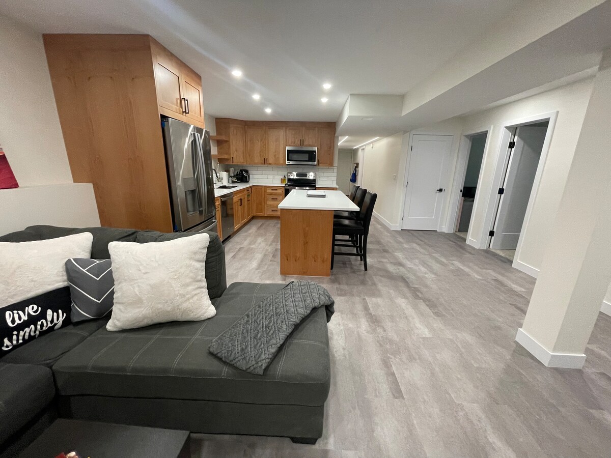 Escape to this lodge-style lower suite w/ a spacious open-concept layout, comfortable furnishings, a well equip kitchen & ample linens. This property is ideal for families, friends, crews or business travelers. Enjoy privacy in a peaceful setting, whether in the spacious living area, dining together, or the mountain view outside area with patio and fire pit. Very large driveway allows for multiple parking spaces, including trailers or boats!