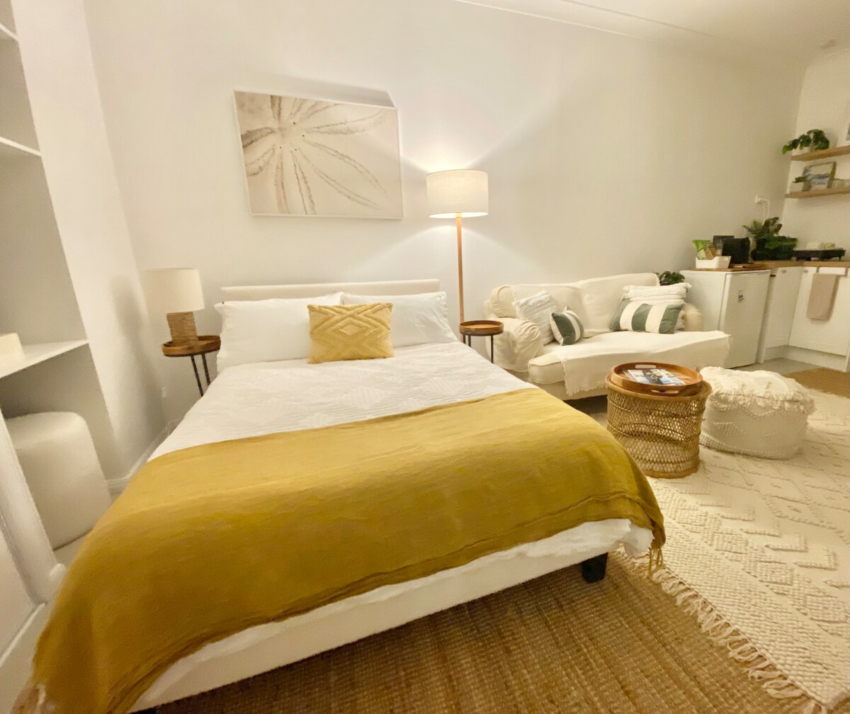 Magrelaks sa naka - istilong Studio na ito kung saan nakakatugon ang Mid - Century sa nakakarelaks na vibe sa baybayin. Bumalik sa isang komportableng retro armchair na may libro o pelikula. Kumuha ng inumin at panoorin ang lumilipas na parada mula sa funky patio. Magluto ng pagkain sa kusinang kumpleto sa kagamitan at kumain sa mesa ng patyo na may estilong Scandi. Isang komportableng pugad sa gabi na may mga blind at screen para mapanatili ang mundo. Matulog nang maayos sa purong cotton bed linen na may tunog ng mga alon para makapagpahinga. Maglakad - lakad sa kalsada papunta sa beach para sa pangingisda, surfing at mga nakakarelaks na paglalakad.