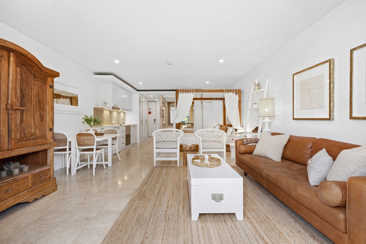 Perpekto ang Saltwood Studio para sa mga mag - asawa at solong biyahero na naghahanap ng espesyal na lugar para makapagpahinga at makapagpahinga. Umalis lang sa iyong pribadong balkonahe para masiyahan sa malalaking hot tub sa labas, mga nakamamanghang pool at tropikal na hardin ng napakagandang boutique na inspirasyon ng Bali na Santai Resort sa Casuarina, NSW. Ang studio ay isa sa napakakaunting mga studio sa resort na ganap na poolside. Ito ay simpleng napakarilag kapag ito ay maaraw ngunit din talagang maginhawa kapag ito ay mas malamig o maulan at ganap na nakamamanghang sa gabi!