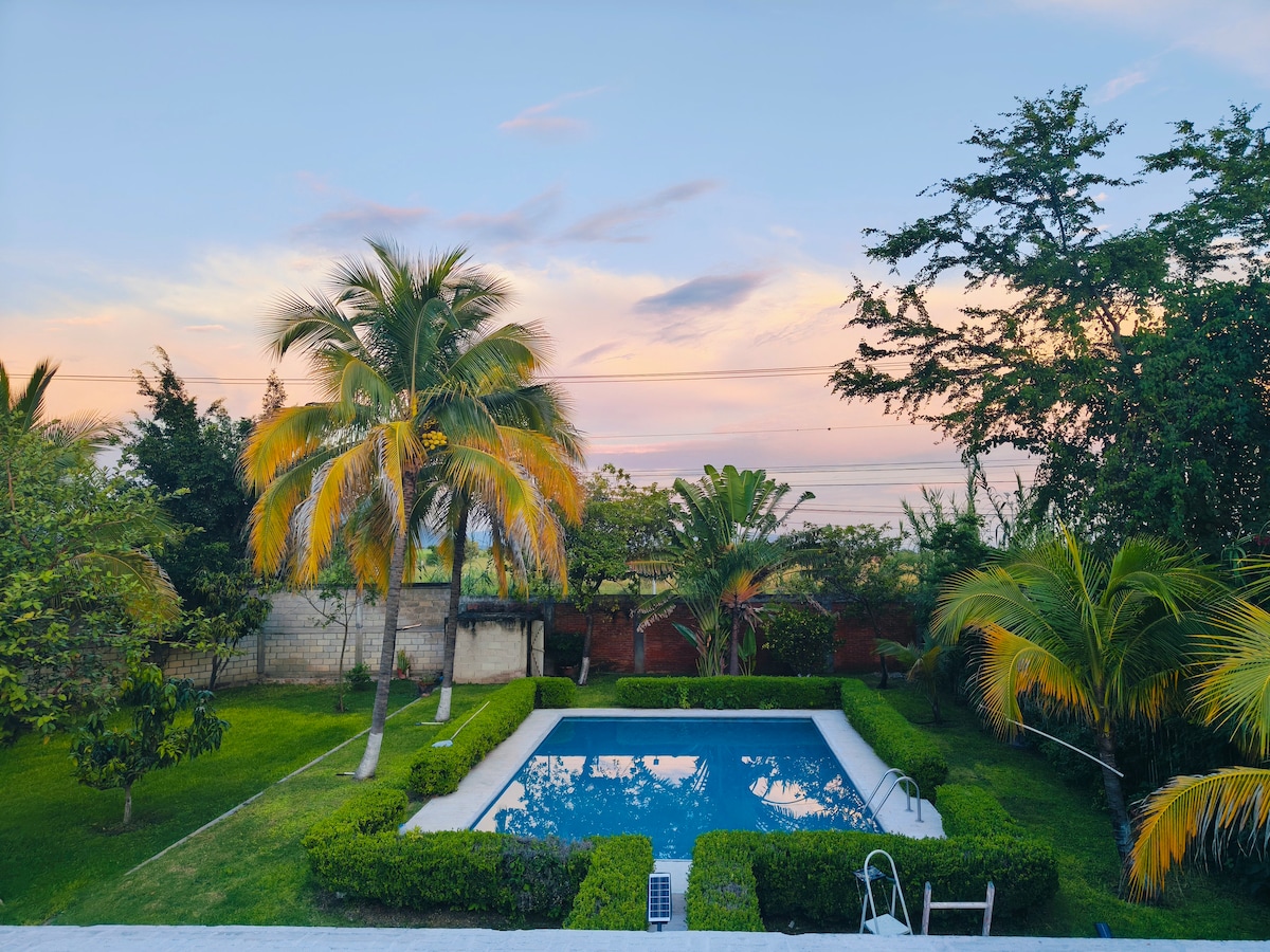 Maaliwalas na bungalow sa labas ng Cuautla, sa isang suburban na kapitbahayan malapit sa kanayunan. Dalawang kuwarto (may dalawang single bed ang una at may isang single bed at isang double bed ang isa pa). Hiwalay na pasukan mula sa pampamilyang property, sa loob ng bakod na lugar na may mga hardin at pool. Malapit sa Yecapixtla, ang lupain ng jerky at sa loob ng maginhawang distansya ng mga restawran at shopping center. 20 minuto lang mula sa downtown Cuautla at 15 minuto mula sa Six Flags Hurricane Harbor.