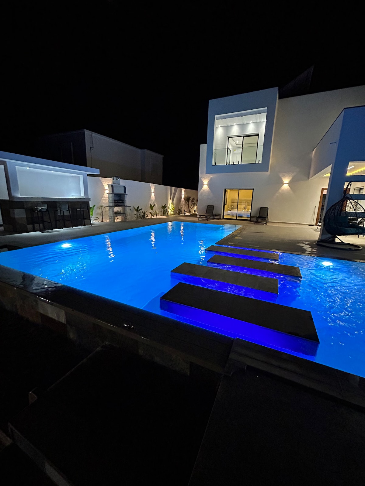 Mararangyang villa na matatagpuan sa isang chic at ligtas na pag - unlad, na napapalibutan ng mga puno ng olibo at puno ng palmera. Malapit ang villa sa lahat ng amenidad: 5km mula sa sentro ng Midoun, ilang minuto mula sa pinakamagagandang beach sa isla at malapit sa mga aktibidad ng turista. Modernong villa sa isang antas na may malinis na linya, ganap na naka - air condition na may malaking swimming pool. Layout na bukas sa labas na may mahusay na liwanag. Doon naghahari ang kalmado, katahimikan at kapakanan.