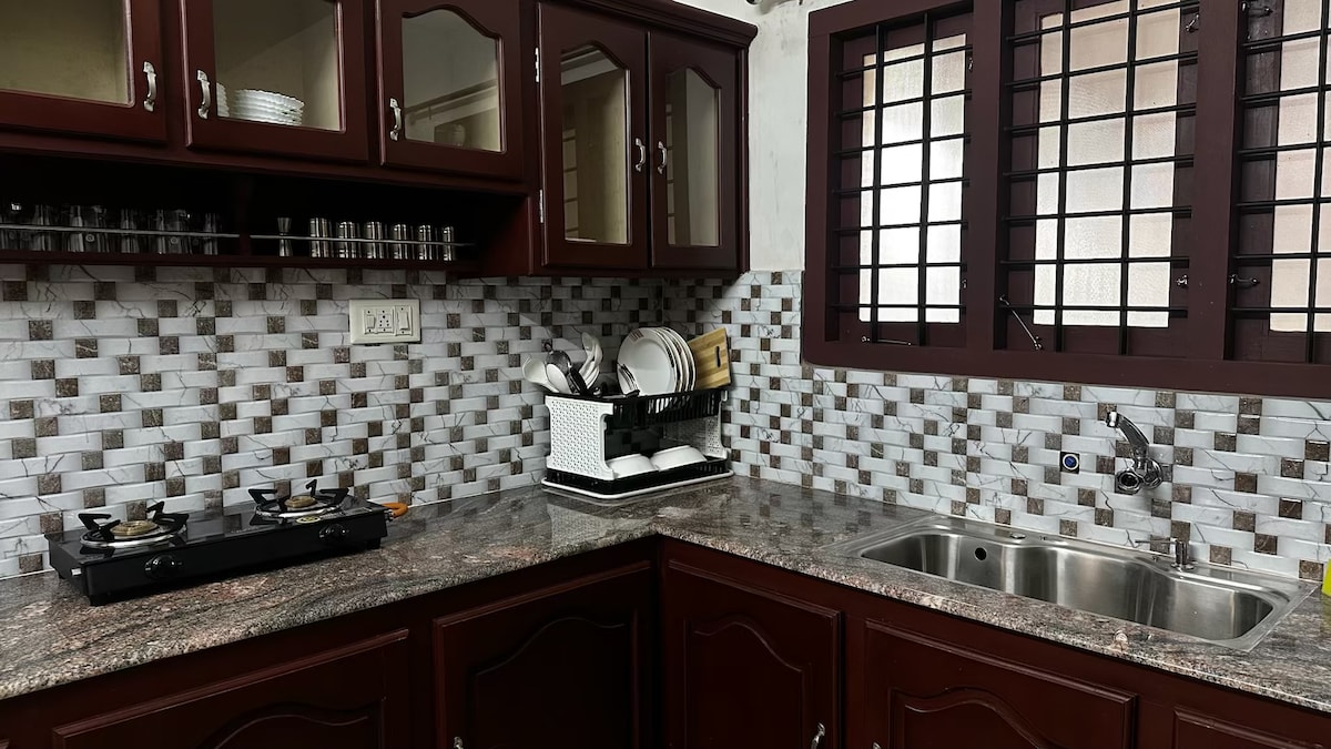 Indeevaram: Puso ng Thrissur City Homestay-AC Comfort at Modernong Amenidad. Welcome sa Indeevaram, ang komportableng bakasyunan mo sa mismong sentro ng Thrissur! Perpekto para sa mga pamilya, magkasintahan, o business traveler, nag‑aalok ang maayos na homestay na ito na may 2 kuwarto ng air‑conditioned na hangin, kusinang kumpleto sa gamit, at walang aberyang pamamalagi. Mga Pangunahing Tampok: 2 AC, Mga Nakakabit na Kuwarto - mga komportableng Double bed. AC Dining Hall: Kumain nang may estilo, perpekto para sa mga pagtitipon ng grupo. Maluwang na Kusina at Lugar para sa Trabaho na may washing machine