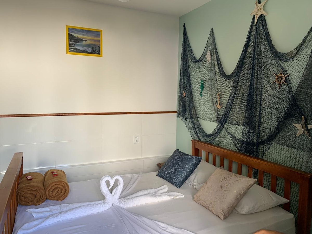 Flat novinho 4 na bloke mula sa Praia do Forte sa Cabo Frio, na may tv, air - conditioning, queen bed at bicama bed, ceiling fan. Maliit na kusina na may microwave, minibar, kagamitan, coffee maker at sandwich maker. Nag - aalok kami ng 200 wire, unan at tuwalya. Super Bem Localo, malapit sa mga bangko, pamilihan, panaderya at pangunahing restawran. Nasa sentro mismo ng lungsod.
