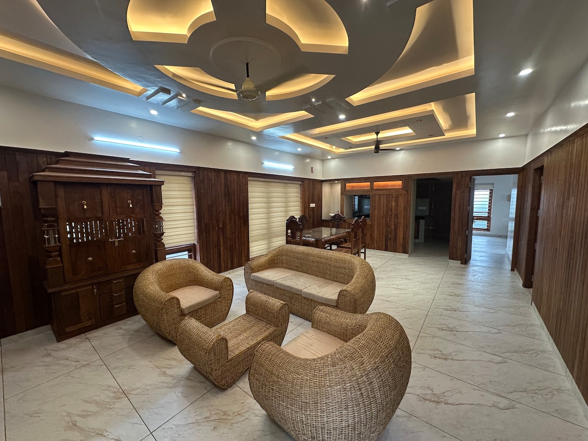 Isa itong 5000sq Villa. Malapit sa lahat ang iyong pamilya kapag namalagi ka sa sentral na lugar na ito. 2Km ang layo mula sa The Sree Padmanabha swami Temple 2.5km ang layo mula sa Central railway station. 3 km ang layo sa International Airport 4km ang layo sa Domestic Airport 1 km ang layo sa National Highway 66. 10Km ang layo mula sa Kovalam Beach may sarili kaming mga cruise sa Poovar Iceland para sa paglalayag sa Backwater. Magbibigay kami ng pinakamababang presyo para sa aming mga kliyente.