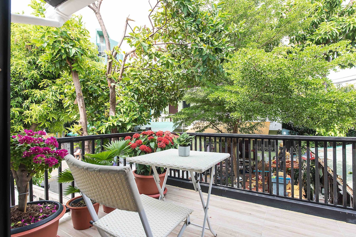 Magrelaks at magrelaks sa isang naka - istilong lugar para sa buong pamilya kapag namamalagi sa gitnang lugar. Magrelaks sa terrace sa tabing - dagat at hayaang matunaw ang problema. Simulan ang umaga sa mga aktibidad na naghihintay sa iyo. Mag - bike papunta sa lungsod, bumisita sa Boxing Stadium, maglakad sa Street food, Yaowarat at mamimili sa gabi. Itinaas ang merkado o gusto niyang gumawa ng aktibidad ng pamilya sa pamamagitan ng pangingisda sa beranda. Mayroon kaming pangingisda na matutuluyan. Malapit na kami sa Wat Arun. Puwede kang maglakad - lakad palagi. Puwede kang bumalik sa pagtulog sa cool na bahay.