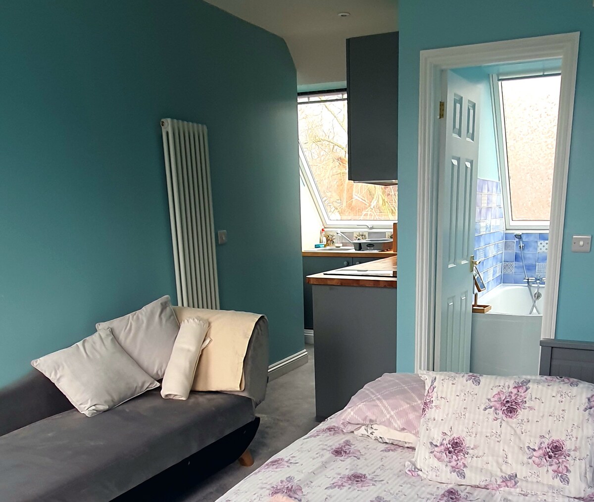 Isa itong pribadong studio flat na may banyong en suite at kusina sa ikalawang palapag ng aming gitnang bahay. Ito ay bagong ayos na may mga bagong applience. Ang self - contained studio na ito ay may kusina, mini refrigerator, glass stove, mini oven, microwave, toaster, mabagal na cooker at kettle. Ang studio ay may Hemnes Ikea bed na maaaring i - setup bilang single o king size bed kapag hiniling. Puwede kaming tumanggap ng pangatlong bisita sa mapapalitan na two - seater.