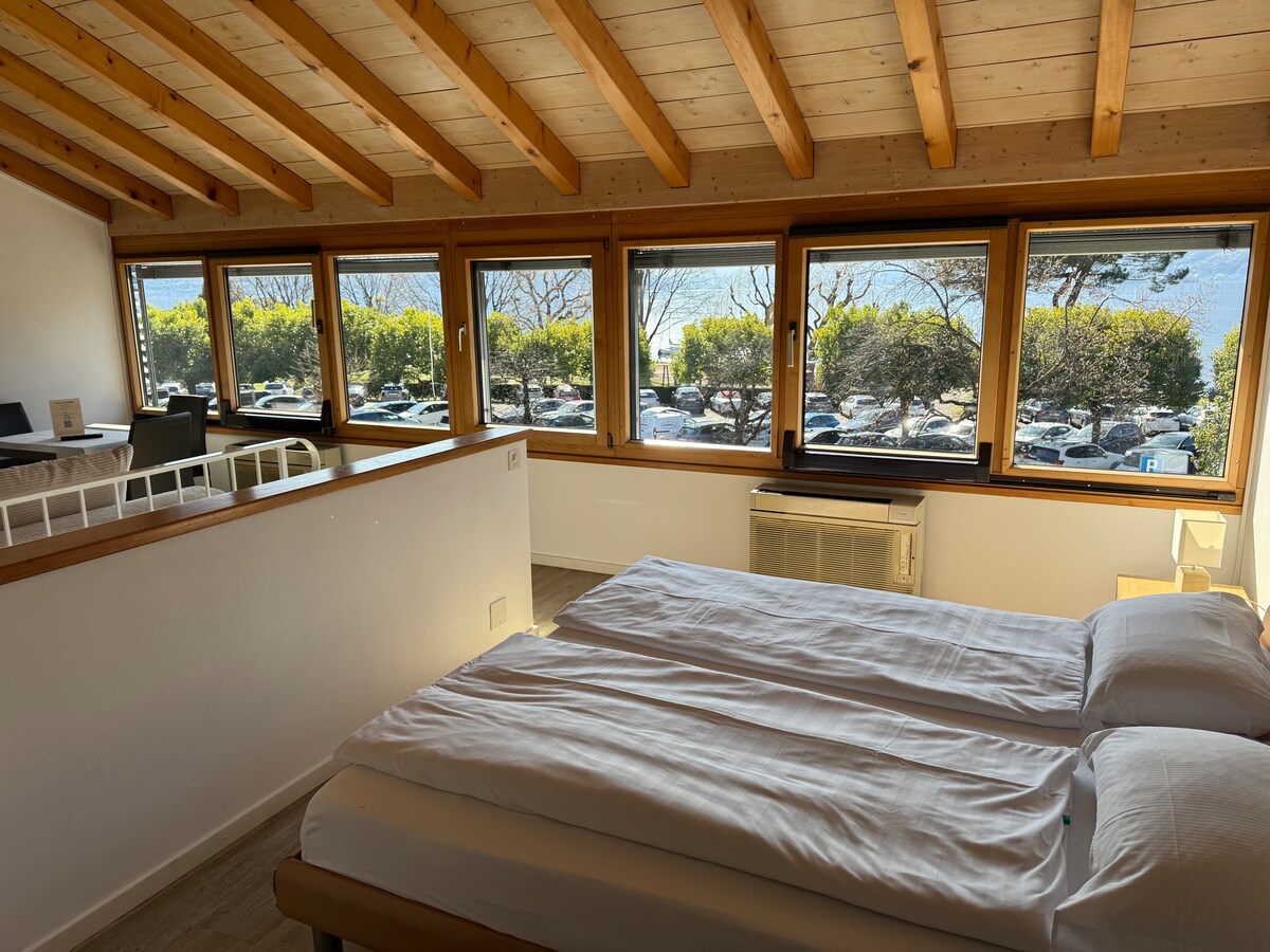 Panoramic top-floor air-conditioned apartment consisting in one panoramic ‘LIGHTHOUSE-TOWER-style’ living room, one spacious twin bedroom, one single bedroom, 2 bathrooms, kitchenette and large sun-deck. We are one of the few listings including the «TICINO TICKET» for FREE use of all public transport in Canton Ticino during your entire stay. Free use of swimming-pool in the garden, extensive breakfast buffet from 6:30 to 10:30 is included and parking available on site for a fee.