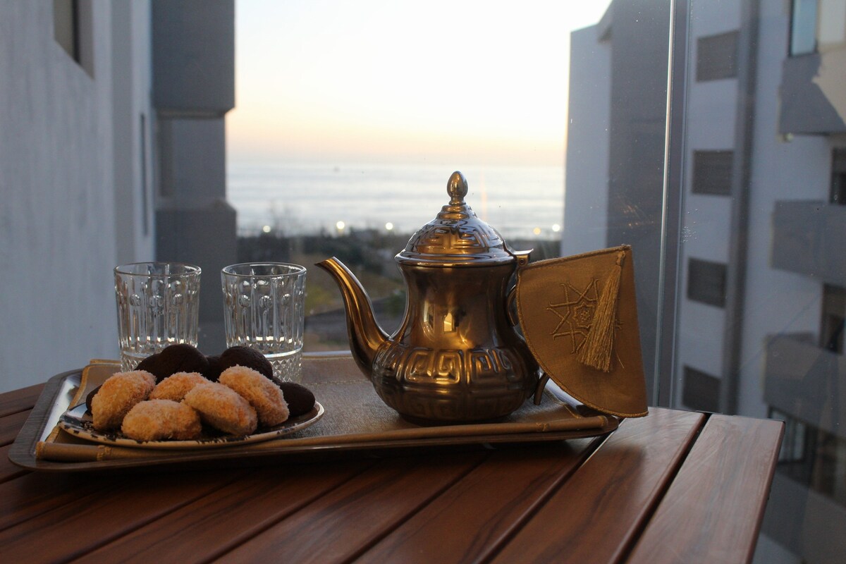 Isang magandang apartment na matatagpuan sa gitna ng taglink_out at sa tabi ng dagat . Ang apartment sa ika -4 na palapag - 5 min sa taxi square at bus 32 - 5 min sa supermarket - 5 min sa lugar ng panorama - -10 min upang mag - surf spot para sa mga nagsisimula - 10 min sa surfing spot hash point - 3 min vers spot de surf Taghart point ( port de Taghazout) binubuo ito ng kusina, 2 silid - tulugan, banyo, balkonahe kung saan matatanaw ang dagat at maliit na sala sa kuwarto. Maaaring bayaran ang paradahan 10 dh par jour.