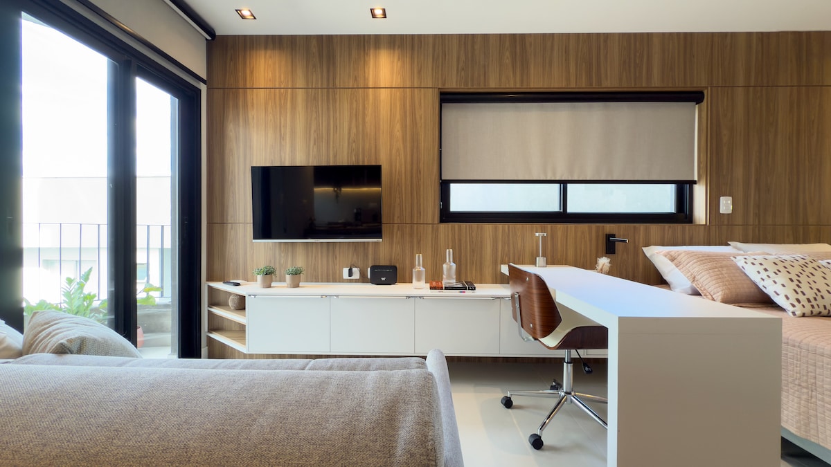 Modernong studio, bago, komportable, perpektong lokasyon, na may magandang tanawin mula sa balkonahe, lalo na sa gabi . Mabilis na wifi, desk, 55"smart TV, queen bed. Air conditioning (mainit/malamig). Washer at dryer at magandang isla sa kusina. 50m2 ng napaka 27th style, Tahimik. Sa Center/Batel, malapit sa mga tindahan, bangko, mall, gastronomic hub at Ospital . Sa gusali :Pool, gym, games room, sauna, jacuzzi, 24 na oras na concierge.