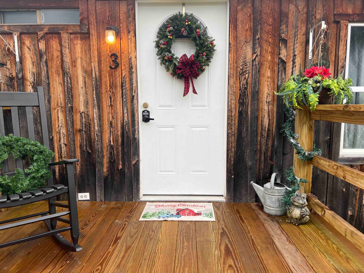 Masiyahan sa 3 silid - tulugan/ 2 banyong country cowboy ranch style house na ito na may creek, fire pit, harap at likod na deck. Ika -1 silid - tulugan 1 king bed 1 master bath (2 lababo, toilet, shower stall at jacuzzi tub!) Dresser Ika -2 BR 1 queen size na kuwarto 1 desk 1 Aparador 3rd BR 1 twin bed & desk Sala Queen sofa bed, Coffee table, TV Ika -2 banyo Lababo, toilet at shower tub Kitchen - Coffee maker, gas oven, refrigerator, microwave, dishwasher, instant pot, toaster/oven, air fryer, crockpot Labahan