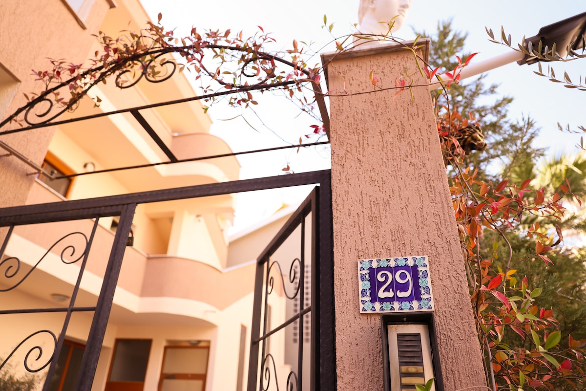 Bumalik at magrelaks sa kalmado at naka - istilong tuluyan na ito. Ang bahay ay dinisenyo ng isang kilalang arkitekto na pinangangasiwaan ang bawat detalye. Mayroon itong sariling pribadong hardin na may swimming pool at maraming bulaklak. Bahagi ito ng marangyang tirahan na 10 minutong biyahe lang mula sa sentro ng Tirana. Nag - aalok ang tirahan ng 24h survellance, gym, restaurant at cafe, ATM, mga serbisyo sa paglalaba, mga running trail, atbp at naka - set sa isang maliit na burol kung saan ang hangin ay talagang sariwa.