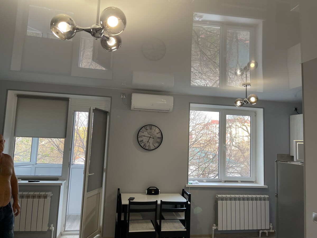 Chic studio Isang natatanging apartment na may bagong pagkukumpuni ng designer. Pinagsasama ng tuluyan ang mga estetika ng luho at pag - andar, na lumilikha ng kapaligiran para sa matingkad na karanasan. Nilagyan ng lahat ng kinakailangang amenidad para sa komportableng pamumuhay at may temang libangan. Available ang mga espesyal na accessory at pandekorasyon na elemento, na binibigyang - diin ang konsepto ng interior.