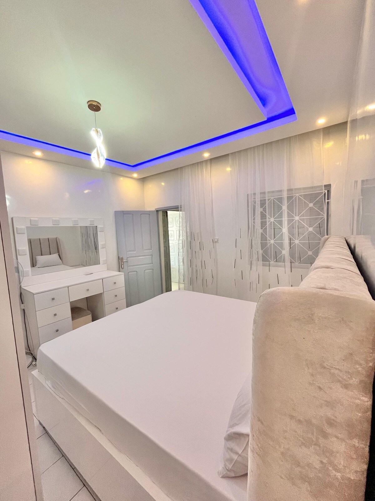 Appartement meublé luxueux localisé à keur massar à 100m du Djolof thicken keur massar. L'appartement est bien équipé et confortable. Il est également proche d'Auchan keur massar et la brioche dorée (environ 3 à 4 minutes en voiture) La sortie 09 de l'autoroute à péage (rond point sédima) est à 5 minutes en voiture. L'Aeroport AIBD est à moins de 35 minutes en voiture. La fibre optique pour une connexion WIFI est disponible 24H/24. La climatisation est disponible (électricité à votre charge)