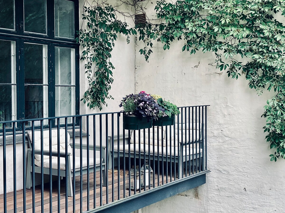 Charming and cosy flat in the heart of central Copenhagen. The middle age city, also called the Latin Quarter. The most lovely and vibrant area in all Cph. From the flat you reach everything in the city center by foot. You have the best of Cph at your door step. The apartment is in the back yard, withdrawn from the street, and safe with a gate, and you can enjoy sitting on the private balcony with your coffee and a drink. The building also has a private green garden you are welcome to use.