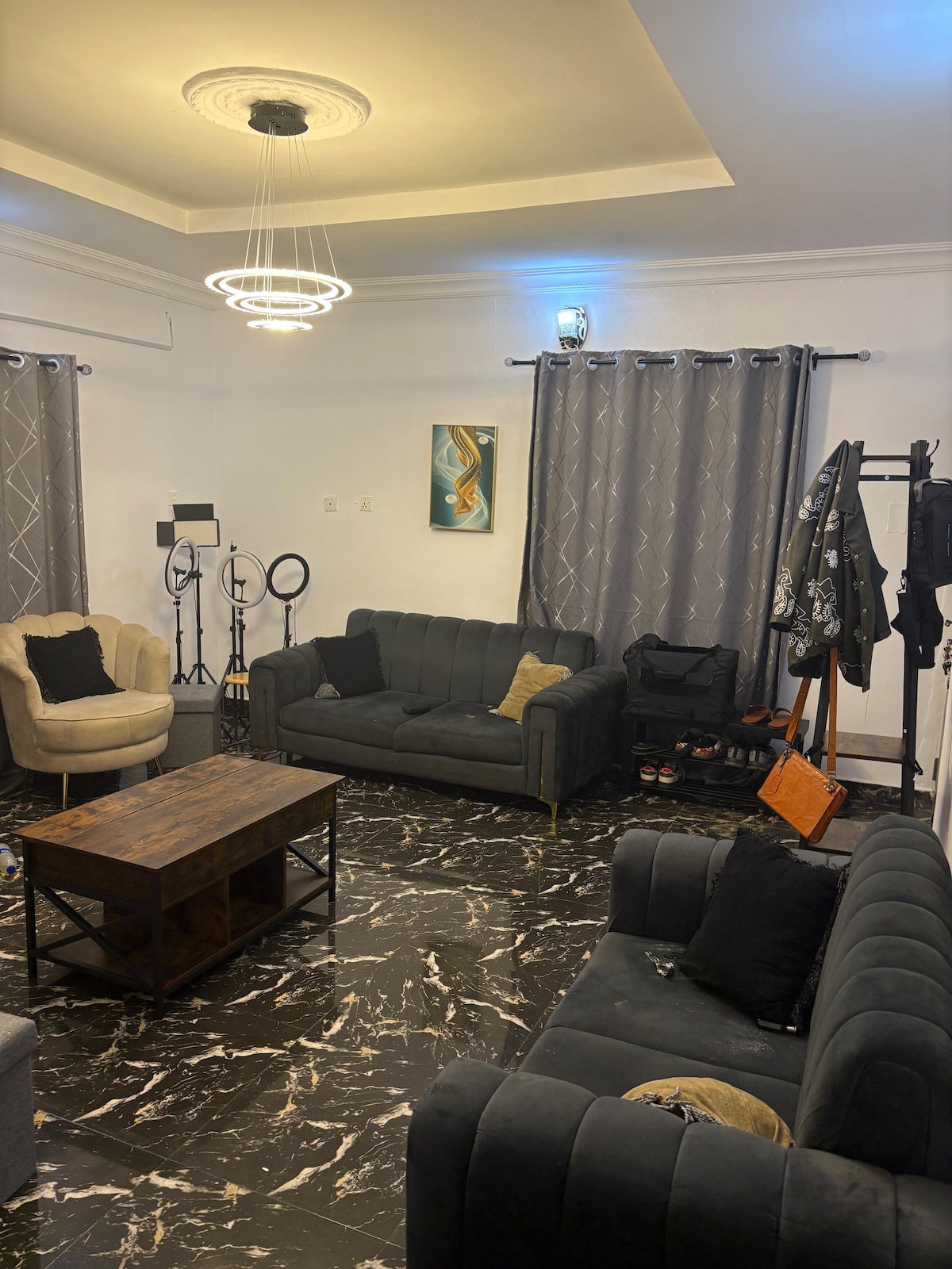 May sariling estilo ang pambihirang tuluyan na ito. Isa itong 1 silid - tulugan at silid - tulugan na serviced apartment. Kabilang sa mga amenidad ang ; - 24/7 na supply ng kuryente - Smoke extractor - Microwave - CCTV camera - DStv/Netflix - TV console - pampainit ng tubig - snooker board - table tennis - washing machine - Malaking paradahan - Pagbabasa ng mga upuan at mesa - Gas cooker - Freezer
