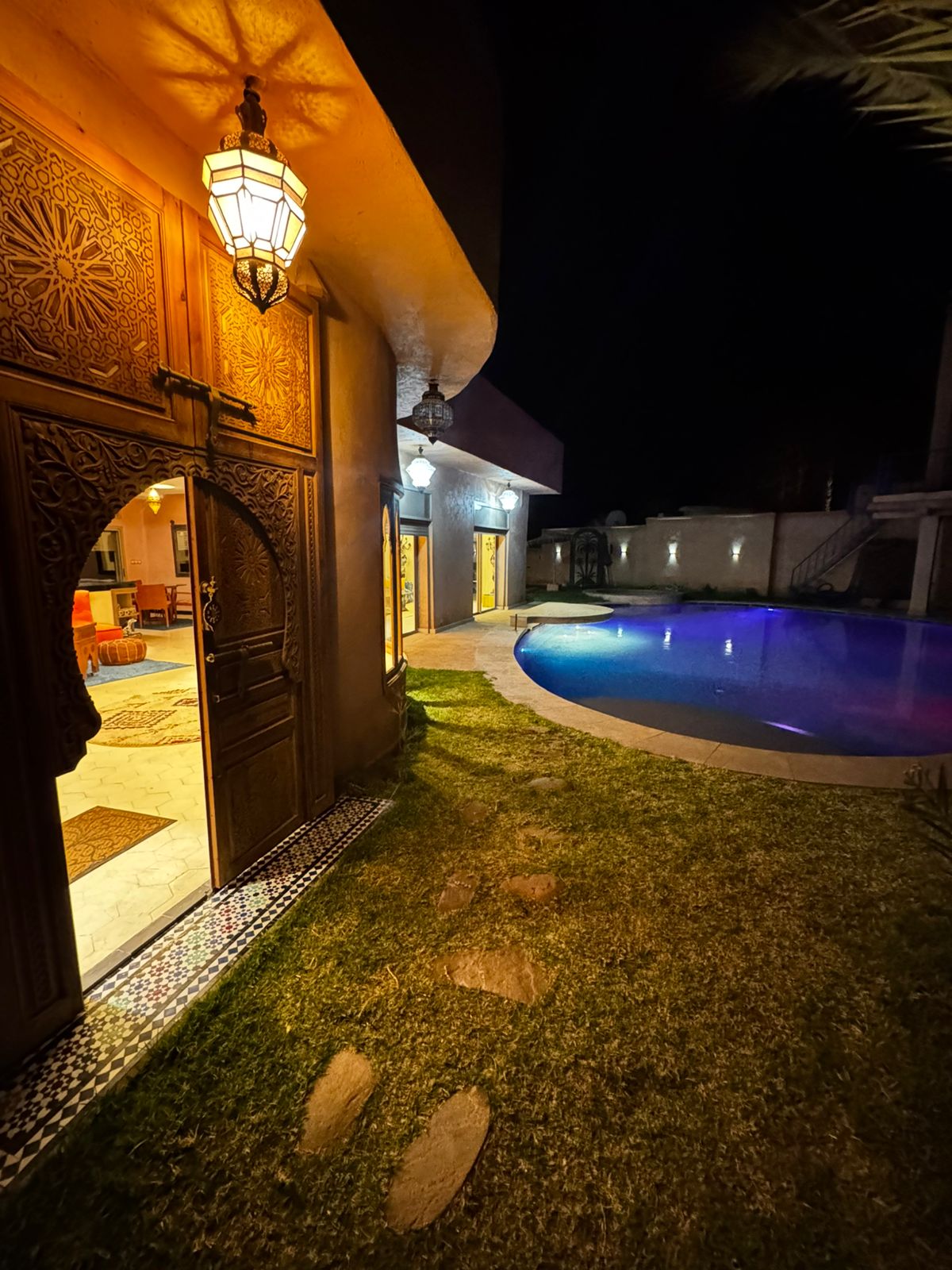 Faites une expérience hors du temps, dans cette magnifique maison marocaine traditionnelle avec sa piscine et son jardin privatif. Idéale pour la famille ou des amis, elle vous permettra de vous détendre dans un cadre élégant et épuré. Elle a été construite en 2010 par un architecte reconnu à Marrakech Un jardin privatif de 650m2, et un beau verger de 3000m2 Terrasse- Toit avec vue sur Atlas Très grande piscine à débordement 14x6m sans vis à vis équipé d Internet et TV satellite ,acces Netflix