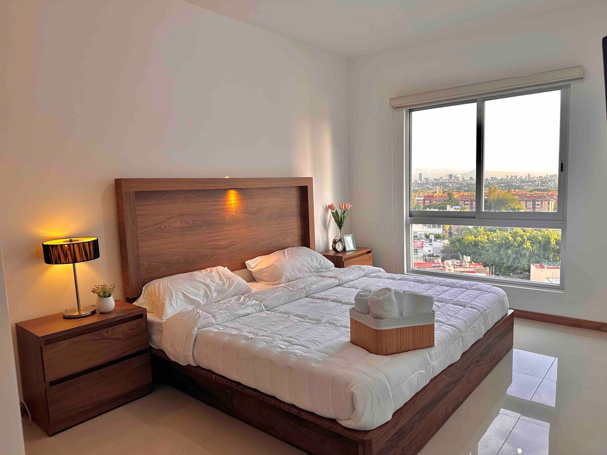 Magandang mainit - init na apartment na may Nordic at minimalist na estilo, sa loob ng isang subdivision na may mga hindi kapani - paniwala na amenidad sa ika -10 palapag Magkakaroon ka ng kamangha - MANGHANG TANAWIN, rooftop POOL, elevator, terrace, 24/7 na seguridad, at pribadong paradahan. Malapit sa lahat ang lugar na ito, na ginagawang madali ang pagpaplano ng iyong pagbisita. Malapit sa iteso uvm dot sur, templo ng mga martir, sa loob ng paligid! Isang bloke mula sa light train Magugustuhan mo lang ang lugar na ito: