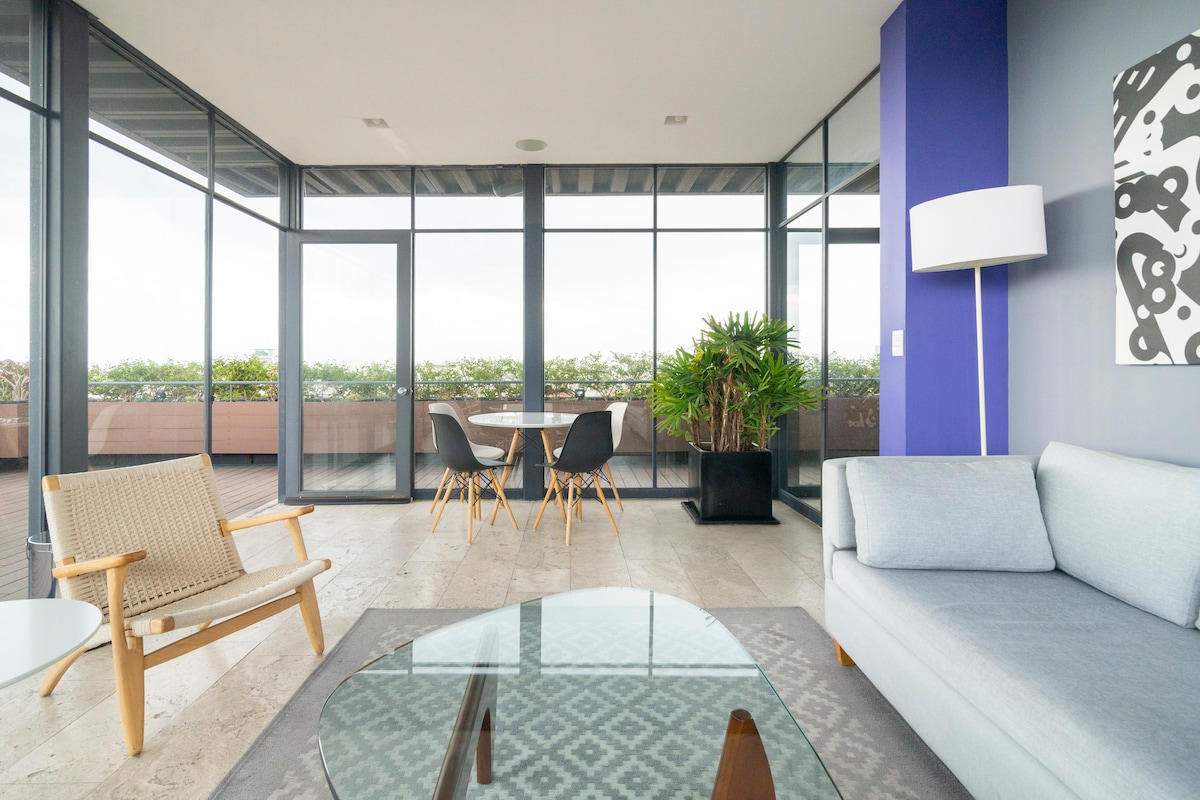 Magandang gusali na may magandang disenyo na matatagpuan sa sentro ng lungsod na napakalapit sa mga pangunahing atraksyon, na may seguridad 24 na oras sa isang araw. Ang loft apartment na matatagpuan sa ground floor ay isang maaliwalas, functional, modernong espasyo, na may lahat ng kaginhawaan, ay may sariling patyo na nagbibigay - daan sa iyo upang makapagpahinga sa anumang oras ng araw kung para sa isang kape, pagbabasa o pag - hang out . Mayroon itong bukas na silid - tulugan, malaking aparador, kusina, silid - kainan, sala, patyo, washer - dryer, kumpletong banyo