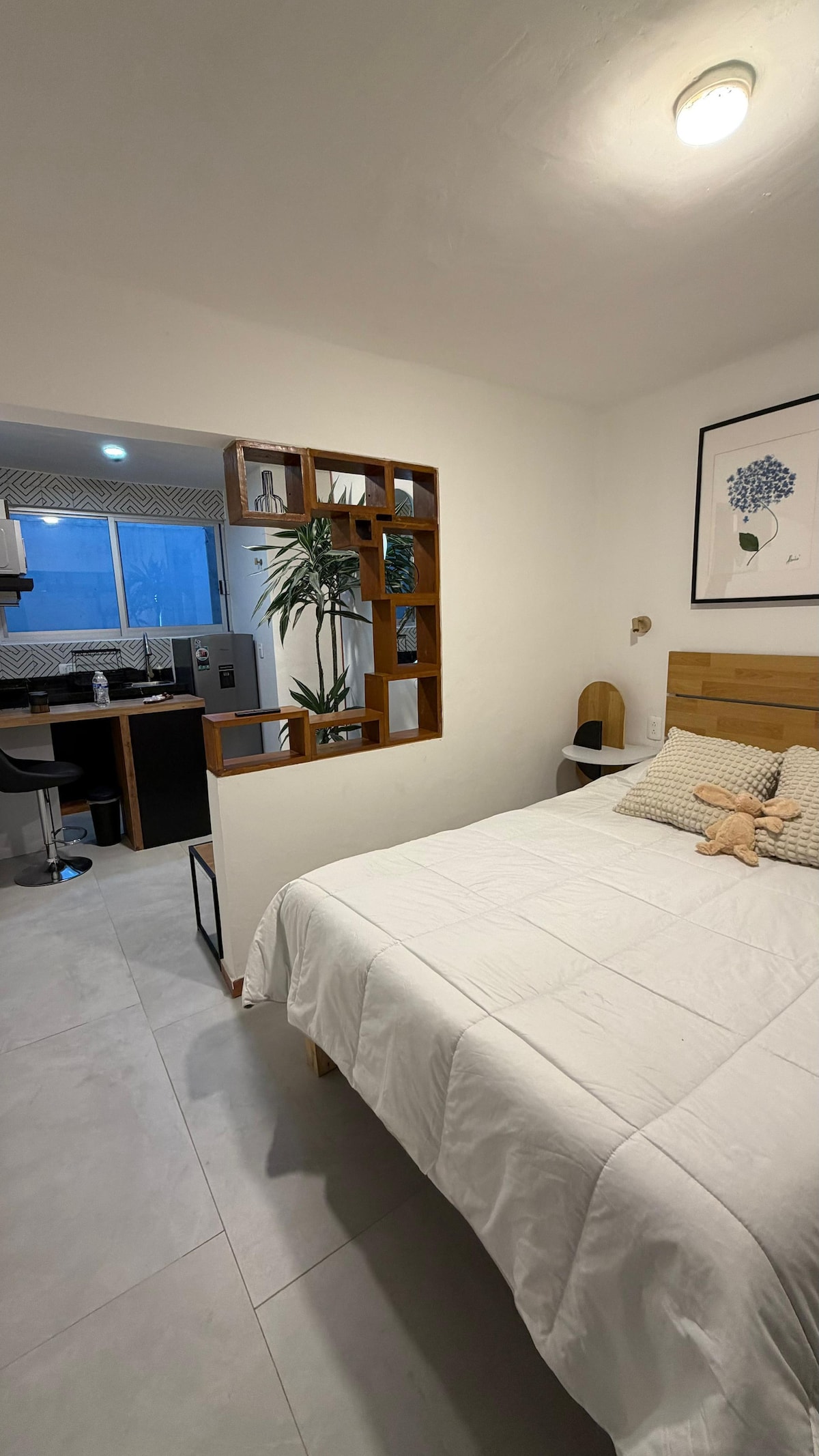 Komportableng loft sa isang pribadong komunidad na may gate, na perpekto para sa pagrerelaks pagkatapos ng mahabang araw. Makakakita ka sa itaas ng double bed, malaking aparador, mga bintana ng tanawin ng hardin, at pribadong terrace. Nagtatampok ang ibaba ng kusinang kumpleto sa kagamitan, kumpletong banyo, washer/dryer, sofa bed, at lounge chair. Mainam para sa mga maikli o pinalawig na pamamalagi. Kung gusto mong maranasan ang tunay na hospitalidad sa Mexico, ito ang perpektong lugar.
