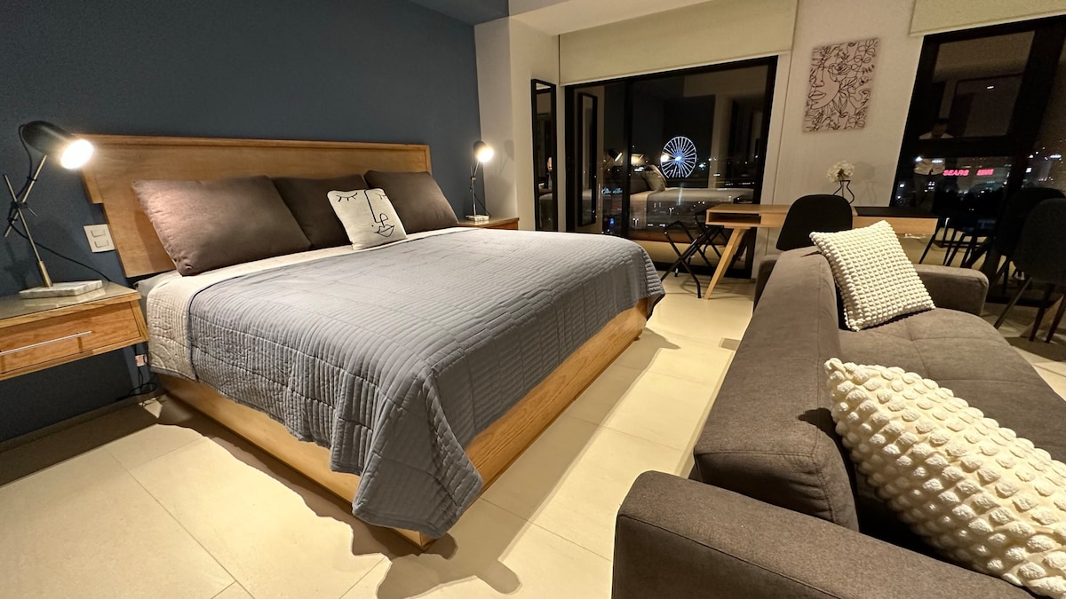 Magandang minimalist loft na may mga luxury finishes, kamangha - manghang tanawin patungo sa Star of Puebla Angelópolis. Mayroon ito ng lahat ng serbisyo para sa maikli, katamtaman at matatagal na pamamalagi. Wifi, Smart TV, microwave, refrigerator, pribadong paradahan, mga amenidad tulad ng swimming pool, jacuzzi, spa, sauna, steam, gym, campfire, zen garden, crossfit, basketball court, yoga at pilates lounge, coworking, boardroom, atbp. Puwedeng tumanggap ang loft ng 4 na bisita, 1 double bed, at 1 sofa bed.