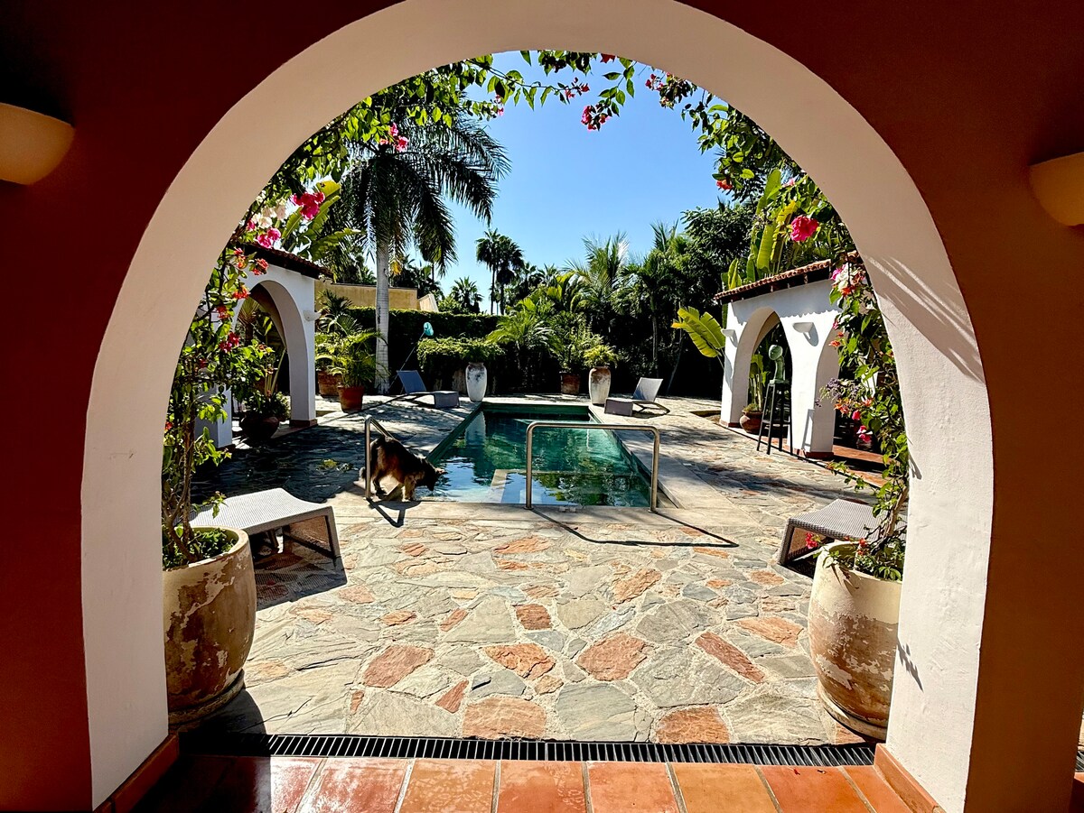 Welcome sa luntiang Hacienda na ito na may lawak na 1 acre at 4 na minutong lakad lang ang layo sa beach. Gisingin ng awit ng ibon, pagbagsak ng alon, at ngiwi ng bubuyog. Maglakad sa daanang lupa na magdadala sa iyo sa malinis na buhangin kung saan lumilitaw ang mga balyena mula sa malalim na asul na karagatan at nagpapalipad ng mga pilak na tubig. Panoorin ang mga batang pagong na mabilis na lumalangoy para makapasok sa dagat. Magpahinga. Umuurong ang mundo. Welcome sa Todos Santos.
