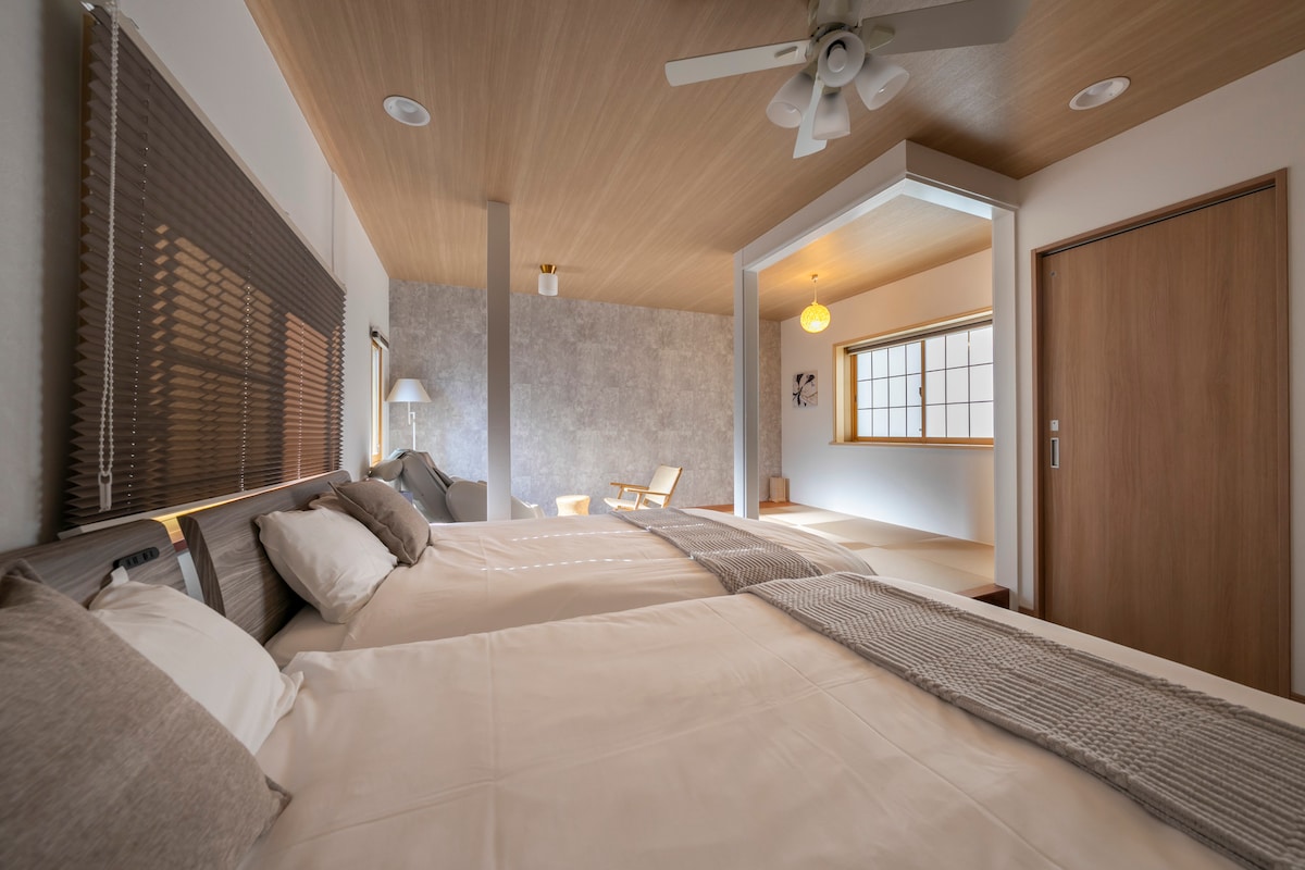 Nagbibigay kami ng ikalawang palapag ( 100㎡) ng bahay na may dalawang pamilya. Nakatira ang pamilya ng host sa unang palapag, ngunit ang ikalawang palapag ay isang ganap na nakahiwalay na bahay na pumapasok mula sa panlabas na hagdan, kaya pinapanatili ang privacy. Ang silid - tulugan ay may 1 kuwarto na may 6 na tatami mats east Japanese - style room (3 set ng futon) + 6 na tatami mats South Japanese - style room, 2 single bed, 1 semi - double bed ay maliit na kuwarto, sala at dining room. Ipinakilala ko ang isang low - eelasticity mattress sa isang all bed. (Tunay na Tulog ang Pangalan)