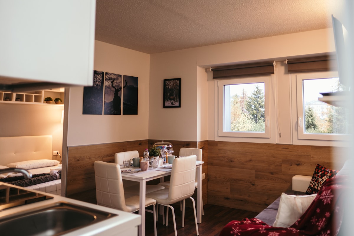 Prestihiyosong ari - arian: ang perpektong solusyon para sa mga hindi malilimutang holiday ng pamilya. Ang magandang tuluyan na ito, na maingat na nilagyan ng pansin sa bawat detalye, ay walang putol na pinagsasama ang modernong estilo sa kagandahan ng alpine. Ang init ng kahoy ay ganap na naaayon sa mga cool na tono ng bakal at mga lilim ng kulay abo, na lumilikha ng isang magiliw na kapaligiran na mayaman sa estilo at lasa. Nagtatampok ang apartment ng maluwang na sala na may fireplace, Smart TV, at sofa bed na puwedeng tumanggap ng dalawang bisita.