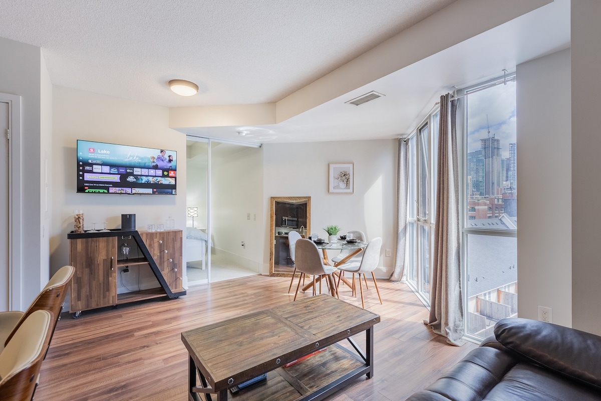 Damhin ang estilo ng Toronto mula sa magandang two - bedroom, two - bathroom condo na ito na matatagpuan sa mataong distrito ng libangan. Sa pamamagitan ng natatanging modernong dekorasyon at mga nakamamanghang tanawin sa timog - kanluran, nangangako ang condo na ito ng tuluyan na kasing - istilong komportable nito. Mapupunta ka sa gitna ng lahat ng ito, na may mga pangunahing atraksyon tulad ng CN Tower, Rogers Center, at ang pinakamagagandang shopping at dining scene sa Toronto ilang sandali lang ang layo. Available ang libreng paradahan at 3 - monitor na workspace.