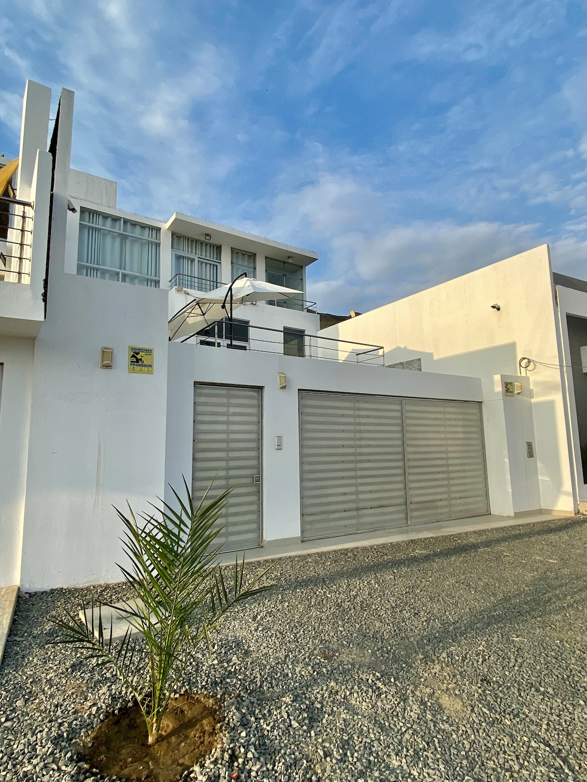 Esta casa de playa temporal, esta ubicada al lado derecho de la bahía, a solo unos minutos de la orilla. La terraza principal amoblada le ofrece una extraordinaria vista del horizonte para gozar del Sunset, y un área de BBQ. El acceso principal es por una sala de estar familiar con la cocina tipo americana. Estacionamiento para 3 automóviles, junto a un minigym. Las habitaciones son amplias, seguras y con baños completos de fácil acceso. Iluminación LED con sensores en espacios abierto.