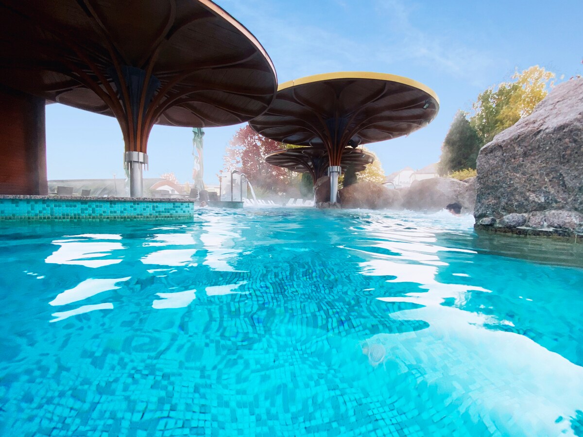 Ilang metro lamang mula sa hangganan ng Austrian ng Lutzmannsburg, ang naka - air condition na apartment sa Zsira ay matatagpuan nang direkta sa golf club. Tinatanaw ng WellnessGolf apartment ang magandang paglubog ng araw at swimming pond. Pinakamaganda sa lahat, ang mga pampublikong paliguan ng Sonnentherme Lutzmannsburg ay 300 metro lamang ang layo mula sa iyong pamamalagi. Ang Bükfürdő Thermal & Spa ay mga 15 minuto sa pamamagitan ng kotse.