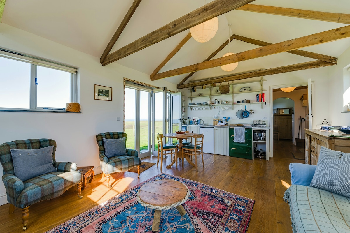 The studio is in a beautiful setting, surrounded by nature, with fantastic views of the sea and surrounding fields. The open plan living space is flooded with light and offers all the modern comfort you need for a recharging break and base for interesting trips in the area. Refurbished with tender, loving and thoughtful care the hosts would like to offer you a place with a special feel good factor. With a wood burner it’s also a warm, cosy nest in the colder seasons.