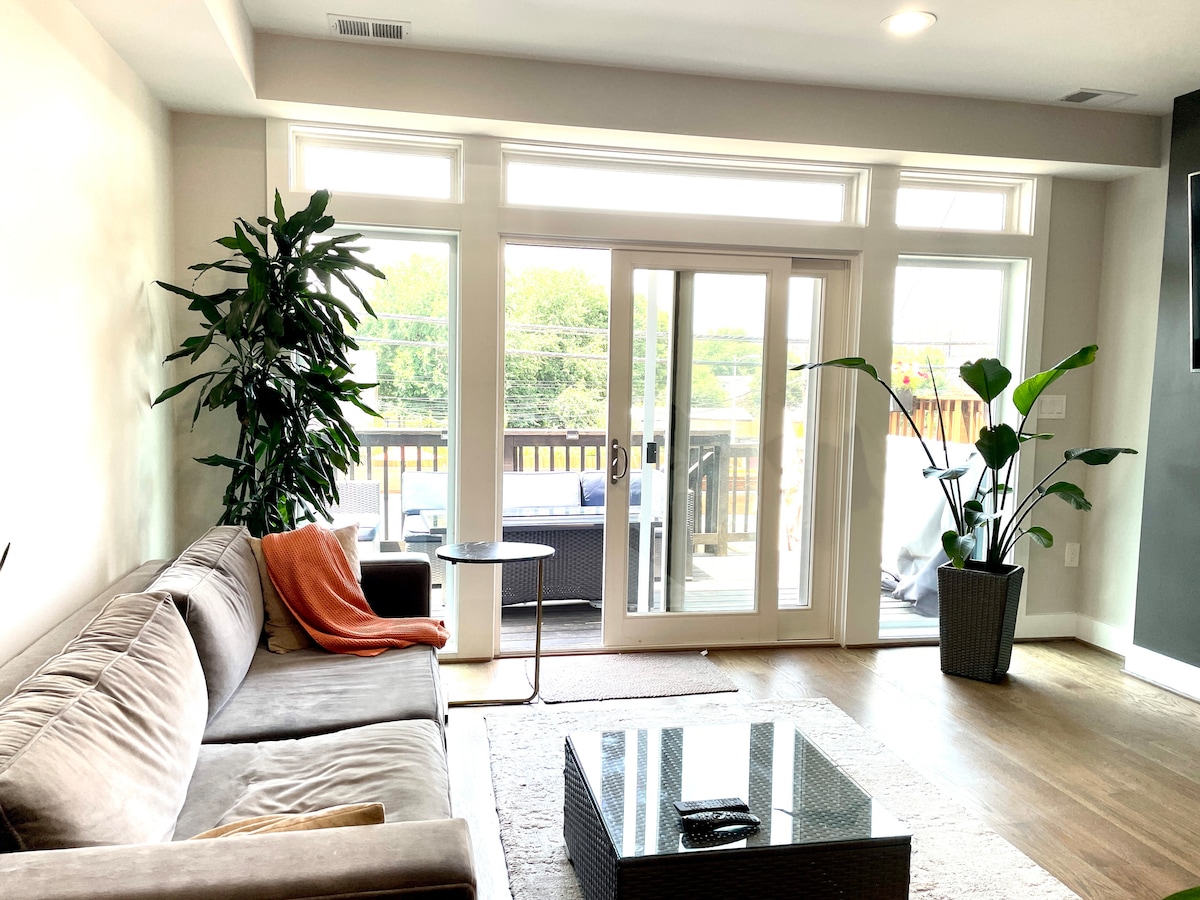 Ang kasaysayan at karangyaan ay nagtitipon sa iyong paupahan na isang maaliwalas na inayos na marangyang sahig na kinabibilangan ng mga nangungunang amenidad, pribadong rooftop deck na may Pergola, dual - sided gas fireplace, marangya at maluwang na banyo kabilang ang washer dryer, solar powered black - out blinds at nangungunang gourmet coffee machine! Malapit kami sa Capital Hill, Brookland, Ivy City, Union Market, & H street corridor at 10 minutong biyahe sa Uber mula sa Union Station. May libreng paradahan sa lugar!