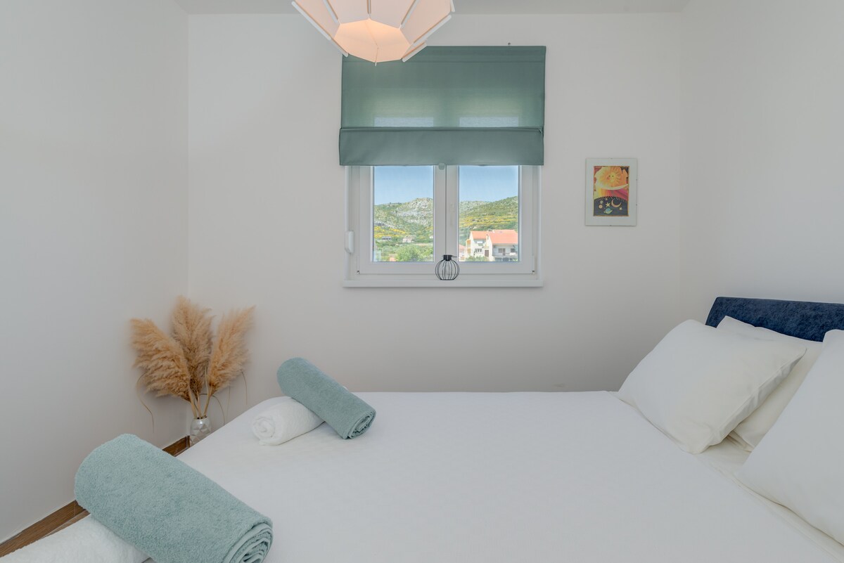 Lovely place. Middle apartment on the second floor. Bit secluded, unlike east and west unit. Amazing view on the sea and distant islands. It has kitchen combined with living area, bathroom, sleeping room with doublebed, plus 1 foldable sofa which can be stretched into a comfy bed. Broad balcony with 2 chairs and a table is a cute place for dining in the summer breeze. Beach is 3 minutes walk from the apartment. Its placed near airport, Split and Trogir. Bus station is below the house.
