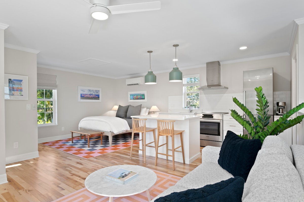 Itinayo ang bagong itinayong carriage house na ito para yakapin ang karakter at kagandahan ng pangunahing bahay, isang 1928 craftsman bungalow. Ang iyong 2nd floor 1 BR apartment ay mahusay na itinalaga na may kumpletong kusina ng chef, sala na may pull - out sofa, at washer/ dryer. Masiyahan sa umaga ng tasa ng kape o isang baso ng alak sa gabi sa malaking beranda. 2 minutong lakad papunta sa mga restawran ng Grand Central, coffee shop, boutique, o kumuha ng bisikleta o scooter para sa 5 minutong biyahe papunta sa Downtown St. Pete o 15 papunta sa mga beach.