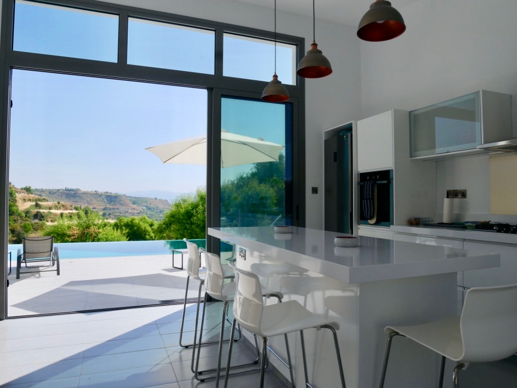 Marangyang tuluyan na may pribadong infinity pool. 3 silid - tulugan na nasa isang palapag, na may mga full height na panoramic window. Mga nakakamanghang tanawin! Ang ika -4 na silid - tulugan ay matatagpuan sa isang mas mababang antas na may hiwalay na access, isang sofa bed at isang ensuite na banyo. Dumadaloy ang mga sala/dining area sa labas papunta sa mapayapang terrace at marangyang infinity pool. Tamang - tama para sa mga romantikong bakasyon o pagkakaroon ng oras sa pamilya. Maglakad sa marmol na hakbang papunta sa malaking pergola na may kamangha - manghang lugar ng BBQ at kusina sa tag - init. Paradahan sa lugar.