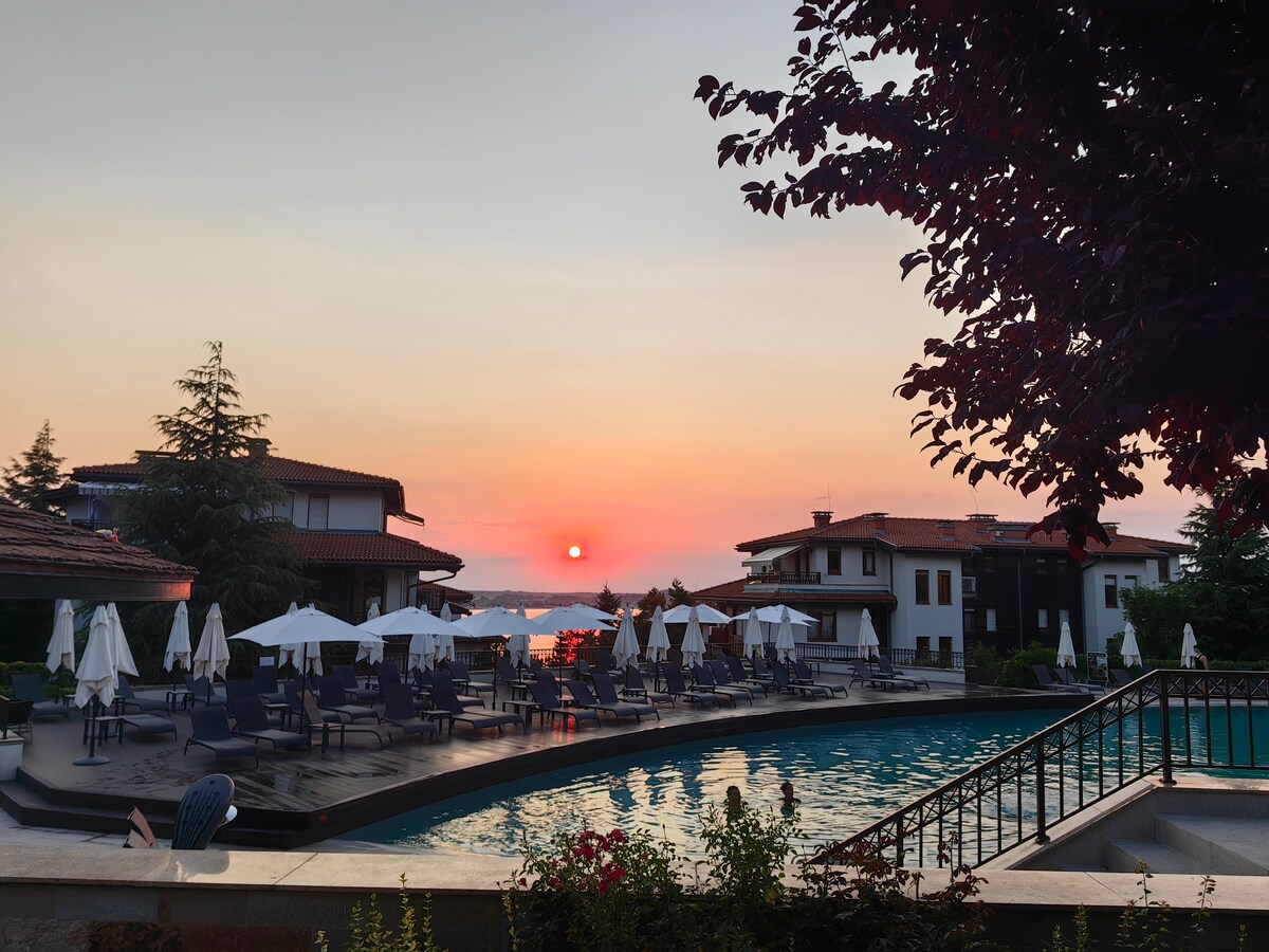Maligayang pagdating sa bago at maaliwalas na apartment sa tabing - dagat! Nilagyan namin ito ng maraming pagmamahal para makapagpasaya ka sa isang tunay na nakakarelaks na pamamalagi sa tabi ng beach. Matatagpuan ang apartment sa isa sa mga themostbeautiful gated complex ng Burgas - Diamond Beach, unang linya papunta sa dagat. Available sa aming mga bisita ang: • Panlabas na pool na may lugar ng mga bata • Mga lugar na libangan • Barbecue corner • Lugar na may tanawin ng parke • 24 na oras na seguridad at video surveillance Pool Sauna Garahe
