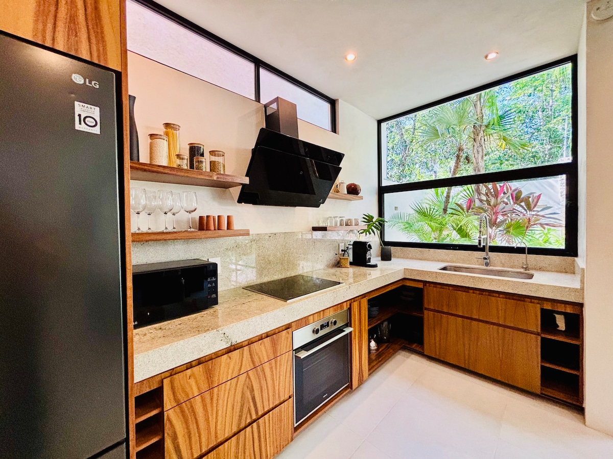 Sa Casa Kuro, nag‑uugnayan ang arkitekturang Japanese at ang kagubatan ng Mayan sa isang tahanang nagbibigay‑pag‑iisip. Ang paglikha ng Namus, isang developer na inilathala sa pinakamahalagang pandaigdigang magasin sa arkitektura tulad ng Architectural Digest, ArchDaily, Design Boom at sa aklat na "The Best of Mexican Architecture of the 21st Century", bilang karagdagan sa maraming internasyonal na parangal.Isang templo para sa mga mahilig sa sining ang apartment na ito sa unang palapag: 2 kuwarto, pribadong pool, tub, at tanawin ng kagubatan.