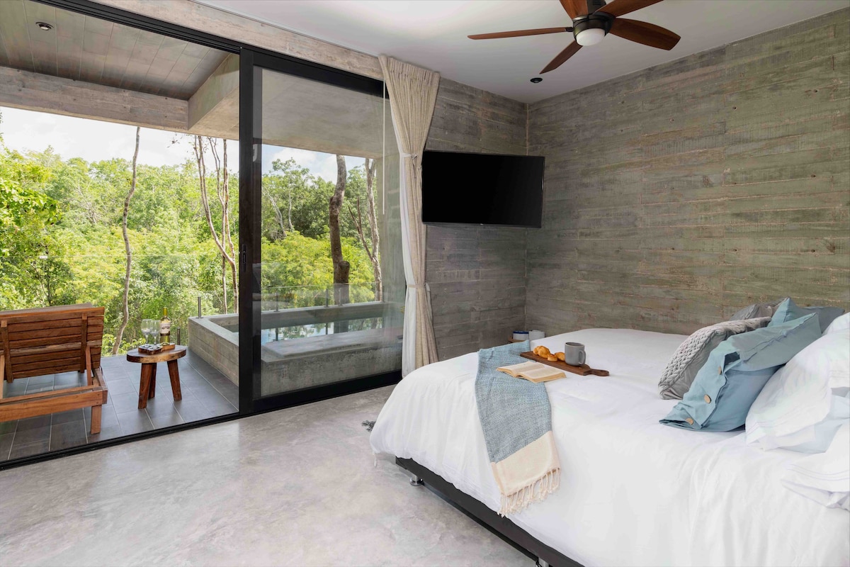 Welcome sa nakakamanghang designer loft na nasa gitna ng kagubatan ng Tulum kung saan nagtatagpo ang modernong arkitektura at likas na kagandahan. Maingat na idinisenyo ang dalawang palapag na open‑concept na loft na ito gamit ang malinis na puting kulay, magagandang kahoy na finish, at piniling dekorasyon para maging elegante at kaaya‑aya ang tuluyan. Puno ng natural na liwanag ang loft sa araw dahil sa mga bintanang mula sahig hanggang kisame, at sa gabi naman, nagbibigay ng tahimik at komportableng kapaligiran ang malalambot na ilaw sa loob at ang magandang tanawin ng kagubatan.