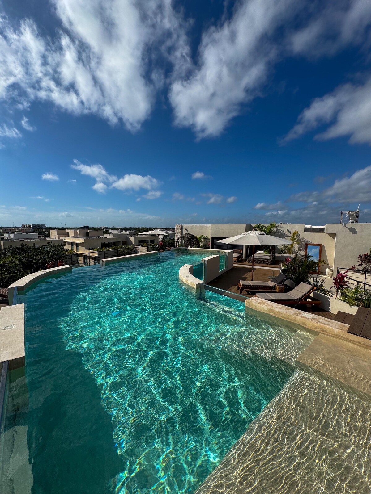 Kamangha - manghang loft apartment na may direktang access sa mga pool, malapit sa Tulum center at ilang minuto lang mula sa mga nakamamanghang beach at Tulum beach club. Masiyahan sa ilang mga nakamamanghang swimming pool, isang roof top pool, sun bed, magandang gym, 24/7 na kawani, malakas na A/C, elevator, mabilis na Wifi (400 Mbps), mga kurtina ng blackout, 55" smart TV, kusina na kumpleto sa kagamitan at pribadong paradahan. Kumain sa labas o uminom lang ng inumin sa rooftop restaurant na may magandang tanawin