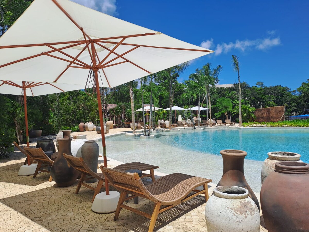 Napapalibutan ng mga maaliwalas na palad, ang natatanging tuluyan na ito ay nag - aalok ng perpektong timpla ng kaginhawaan at kaginhawaan. Matatagpuan 7 minuto lang ang layo mula sa beach, La Veleta, at 10 minuto mula sa downtown, madali mong maa - access ang lahat ng iniaalok ng Tulum. Masiyahan sa isa sa pinakamalalaking pool sa Tulum, libreng beach shuttle, at gym na kumpleto ang kagamitan. Nagtatampok din ang complex ng spa, mga on - site na restawran, at convenience store. Mayroon kami ng lahat ng kailangan mo para sa walang aberya at nakakarelaks na pamamalagi.