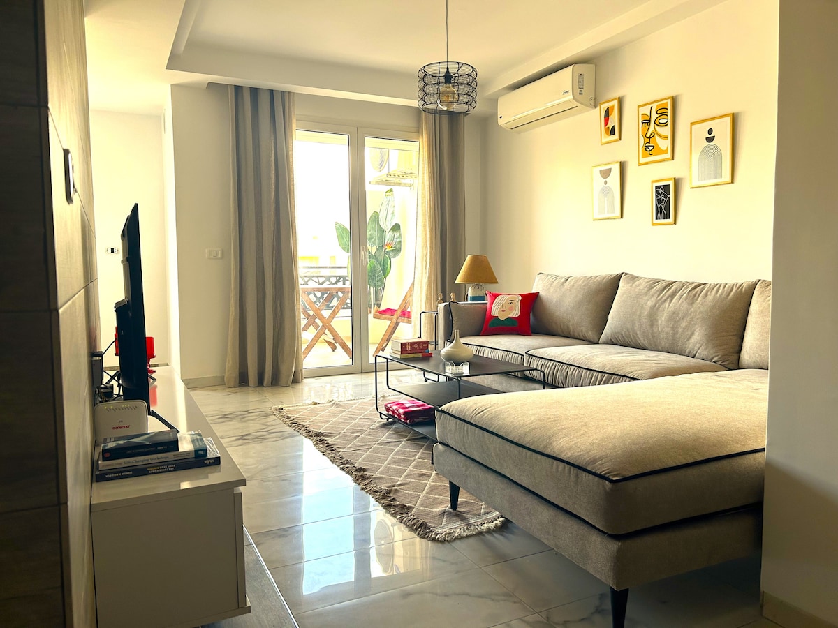 african - style apartment, isang kanlungan ng kapayapaan kung saan ang bawat detalye ay nagpapahiwatig ng kakanyahan ng Africa. Masiyahan sa komportableng sala na may smart TV, maaraw na balkonahe na may mga tanawin ng kalikasan, kumpletong kusina, at modernong banyo na may shower. Matatagpuan sa pinakasikat na lugar ng La Marsa, 2 minutong lakad lang ang layo mula sa beach, na may mga restawran, grocery store at istasyon ng bus sa malapit. Isang lugar na inirerekomenda ng mga expat at mainam para sa pagtuklas sa lugar.
