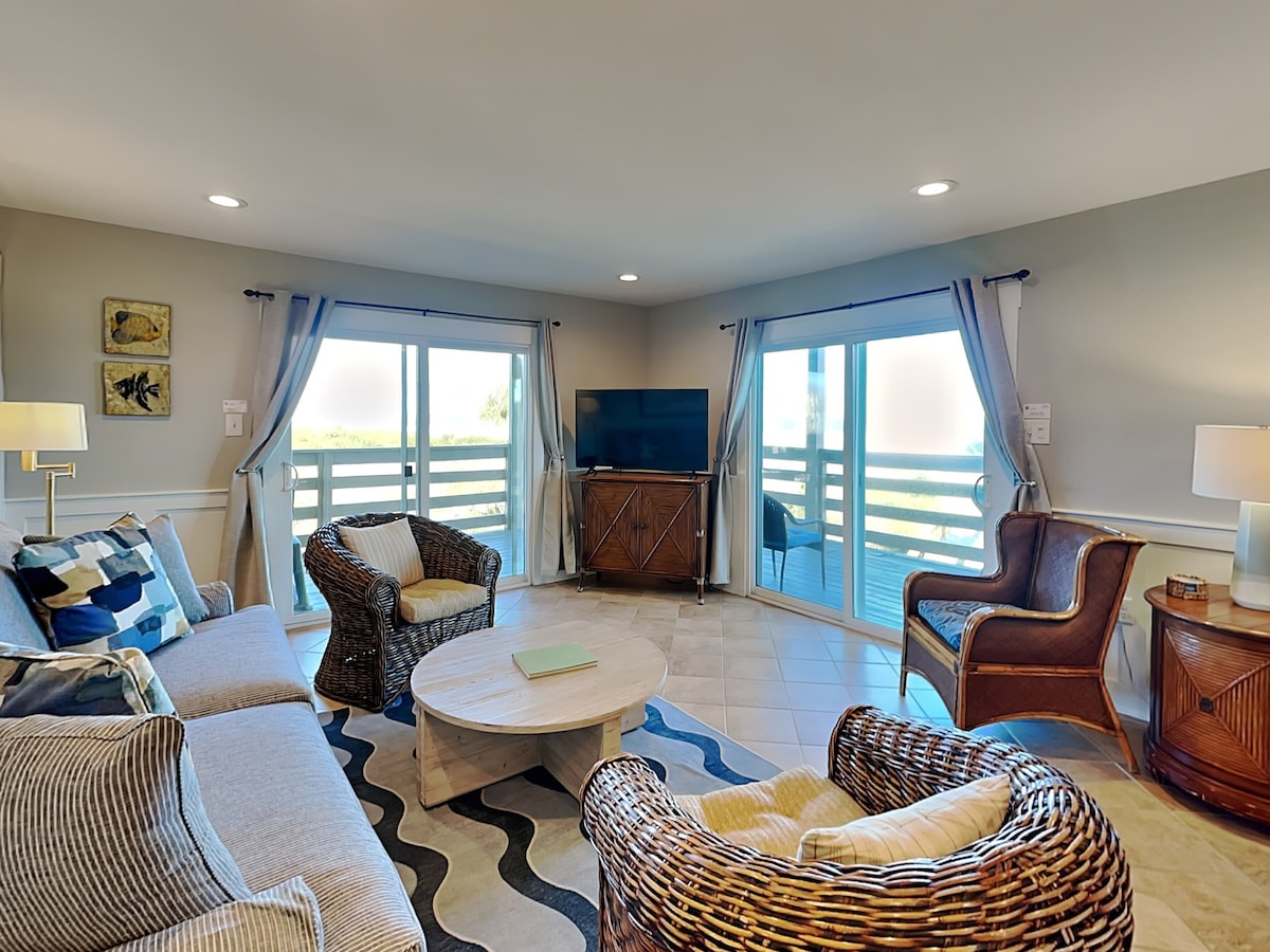 Binoto ang #2 Airbnb ng Tybee Magandang condo sa pinakataas na palapag na may tanawin ng karagatan at direktang access sa beach. May mga tuwalya, upuan, at payong sa beach! Makakagamit nang LIBRE ang mga bisita (HINDI KASAMA ang mga pamamalagi mula Hunyo 27 hanggang Hulyo 13, 2026) ng golf cart namin na may island parking pass. Halaga ng $200+ kada gabi. Ang aming beach ay may matatag na buhay sa dagat, kabilang ang mga dolphin. Sinasabi ng ilan na parang pribado ito. Ito ay isa sa ilang mga yunit ng elevator ng complex at sa isang bldg na pinakamalapit sa beach, na may 2 swimming pool, kiddie pool, tennis/pickleball, at ihawan