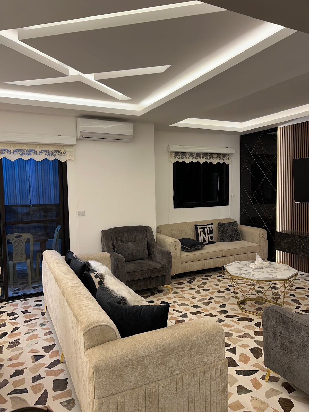 Kalimutan ang iyong mga alalahanin sa maluwag at tahimik na lugar na ito na may 3 silid-tulugan na flat na may 4 na balkonahe at modernong muwebles. May 2 banyo (isa ang en-suite), 1 kuwartong may king-size na higaan, at 2 kuwartong may 4 na maliit na double bed na mainam para sa mga pamilya o grupo. May Smart TV (Netflix, Disney+, Shahid, YouTube), mabilis na wifi, at kumpletong kusina. Nasa ika-3 palapag ito (walang elevator). Puwedeng magpa-pickup sa airport kapag hiniling (may dagdag na bayarin). Kumportable, maluwag, at madali! Responsibilidad ng mga bisita ang pagbabayad ng singil sa kuryente