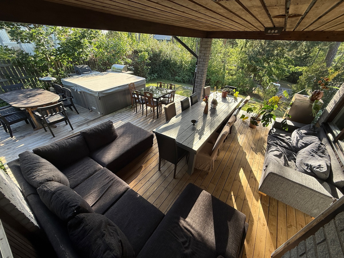 Koppla av med hela familjen i detta fridfulla hus med en stor tomt fylld av blommor och träd. Njut av havsutsikten, ett enskilt läge, tystnaden, naturen och bara hundra meter ner till havet. Tillgång till Kajaker och Stand Up Paddleboard finns. Vid havet ligger brygga och mindre sandstrand för bad och sola. 1 km bort till mataffär, bibliotek och restauranger vid Tyresö Strandtorget. 1 km till Tyresö slott med vacker engelsk slottspark.