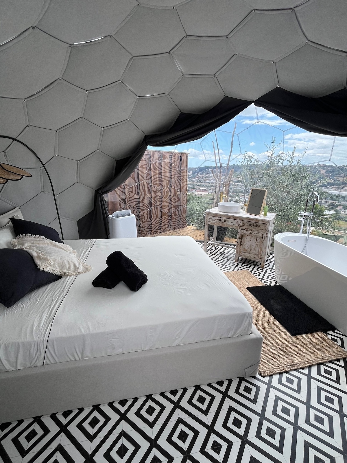Dormez sous les étoiles, baignez-vous face aux collines, vibrez dans un cocon de design et de nature à Nice. Dôme sous forme de suite de 17m², 50m² terrasse, Spa privé chauffé l’hiver, lit queen-size, transats et coin repas en plein air : tout invite à la déconnexion. À deux pas de la ville, vivez une pause romantique et luxe. Une parenthèse rare, intime et raffinée, pour vivre l’évasion urbaine autrement. À votre arrivée, des petites attentions et des expériences vous seront proposées.