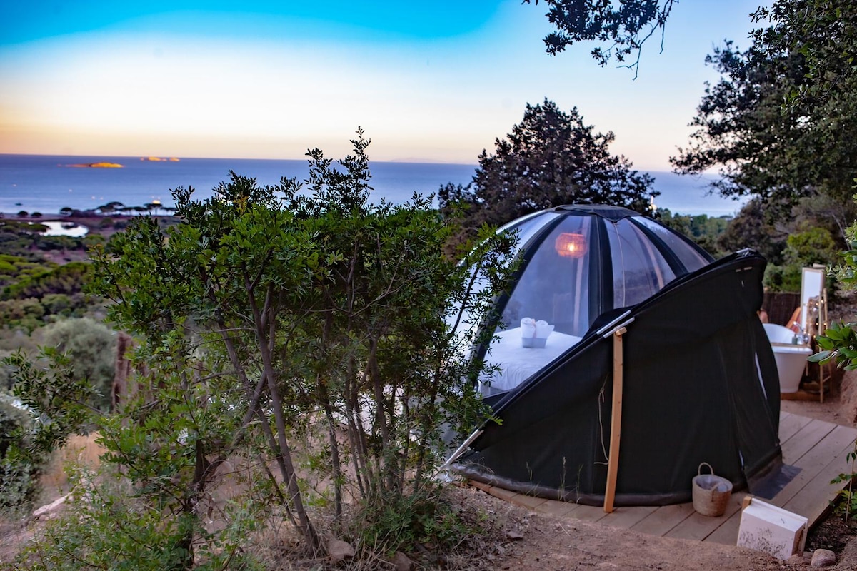 Ang komportableng dome na ito, na nakaharap sa dagat, ay nag - aalok sa iyo ng paglulubog sa ligaw na kagandahan ng isla, ilang hakbang lang mula sa mga nakamamanghang beach. Mayroon itong pribadong dry toilet at outdoor shower, malapit sa iba pang katulad na pasilidad. Para sa iyong kaginhawaan, may mga toiletry at robe, at masisiyahan ka sa air conditioning, kettle, heating, outdoor dining area, at mga nakamamanghang tanawin ng dagat.