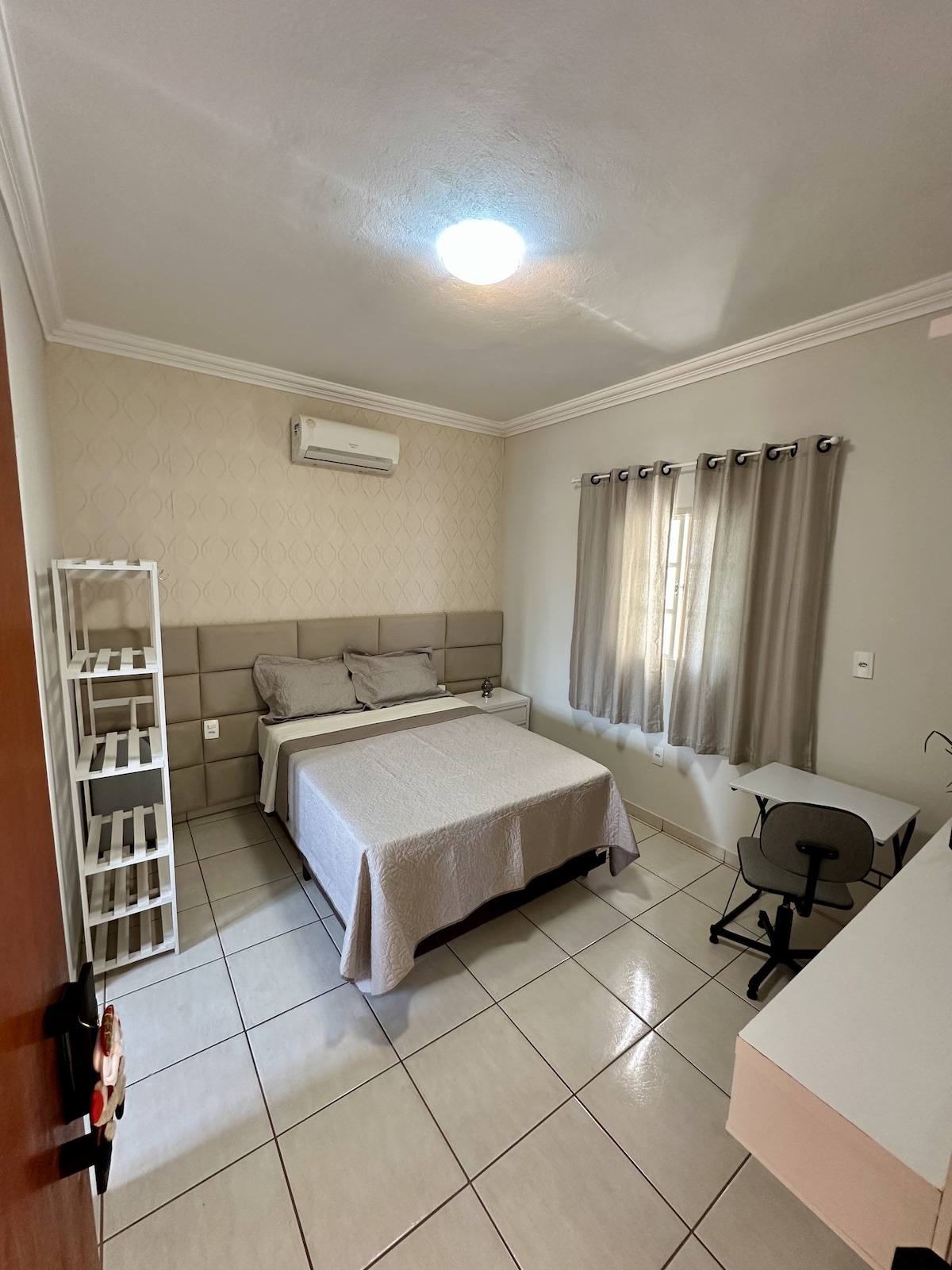 Buong Apartment - 130m ², sahig na porcelain. May 3 kuwarto ito na may air conditioning at locker, at kayang tumanggap ng hanggang 6 na bisita. Malaking balkonahe na para lang sa mga bisita, na may mesa, upuan, at network. Kumpletong kusina at labahan na may washing machine. Wi-Fi, Smart TV 42″. May takip na garahe. Magandang lokasyon. 3 minuto ito mula sa Municipal Market Access sa apartment, para lang sa mga taong kasama sa reserbasyon. Mga hindi naninigarilyo. 220 V.