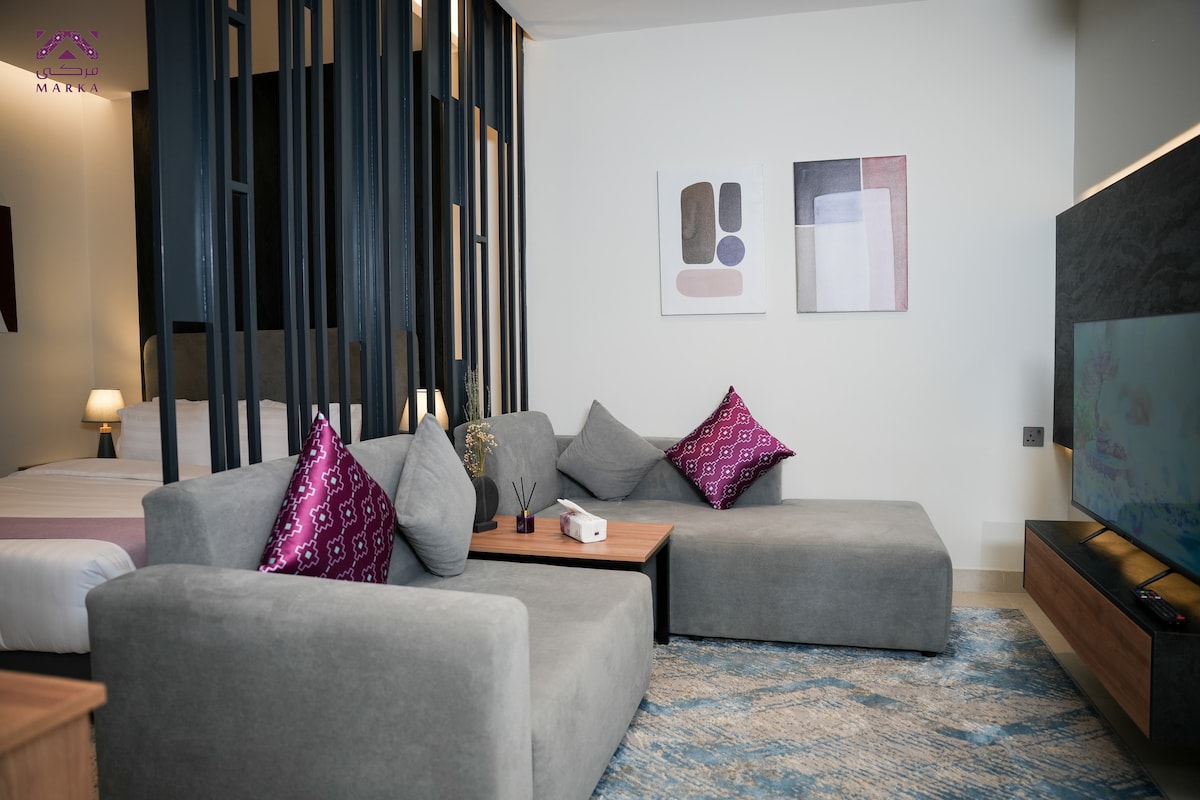 Mararangyang studio na may: • Komportableng master bed para matiyak ang tahimik na pagtulog. • Naka - istilong seating area na may komportableng sabon. • HDTV na mapapanood. • Coffee corner para sa mga maiinit na inumin. •Handang Kusina. • Pribadong banyo na may lahat ng rekisito ng shampoo, sabon, at shower gel para sa kumpletong kaginhawaan. Malapit : Wala pang 10 minuto ang layo ng Moske ng Propeta Al - Haramain Train Station na wala pang 10 minuto Prince Mohammed bin Abdulaziz Airport wala pang 15 minuto